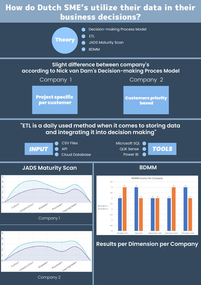 De 35 betrokken studenten maakten bij hun research gebruik van Big Data Maturity Models (BDMM), ontwikkeld door Comuzzi en Patel (2016) en van de Data Maturity Scan, ontwikkeld door JADS MKB Datalab. Daarnaast namen ze bij 15 MKB-bedrijven interviews af en verzamelden zo primaire data.