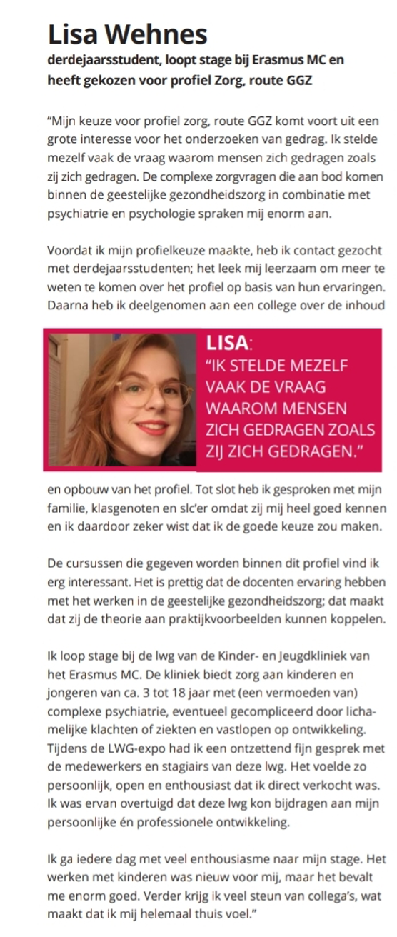 - Noa: Nooit had ik gedacht dat de stage in je derde jaar mij zo veel zou leren. Niet alleen leer ik ontzettend veel over het inhoudelijke werk, de organisatie en de doelgroep. Maar ook heb ik zo veel geleerd over mijzelf; hoe reageer ik op bepaalde situaties? Hoe ben ik in een intensieve samenwerking binnen een team? Hoe is het om 32 uur per week te werken voor een heel schooljaar? En wat vind ik nou écht lastig? Met al deze vragen wordt je intensief begeleidt vanuit verschillende hoeken. Door je stagebegeleider, Lonneke, de LWG-bijeenkomsten met je SLC’er en mede stagiaires en ten slotte de supervisie vanuit de Hogeschool. Hierdoor kan je je optimaal ontwikkelen. Ik had op geen enkele plek liever deze stage gelopen en sta iedere dag weer met ontzettend veel enthousiasme op om naar de kliniek te gaan. Het is een zware en intensieve stage die veel van je vraagt; emotioneel, mentaal en ergens ook fysiek. Je bent continue bezig en de doelgroep kan je flink uitproberen. Ik wens iedereen eenzelfde ervaring toe als de mijne en als je opzoek bent naar een uitdagende stage denk ik dat je hier helemaal op je plek zal zitten.