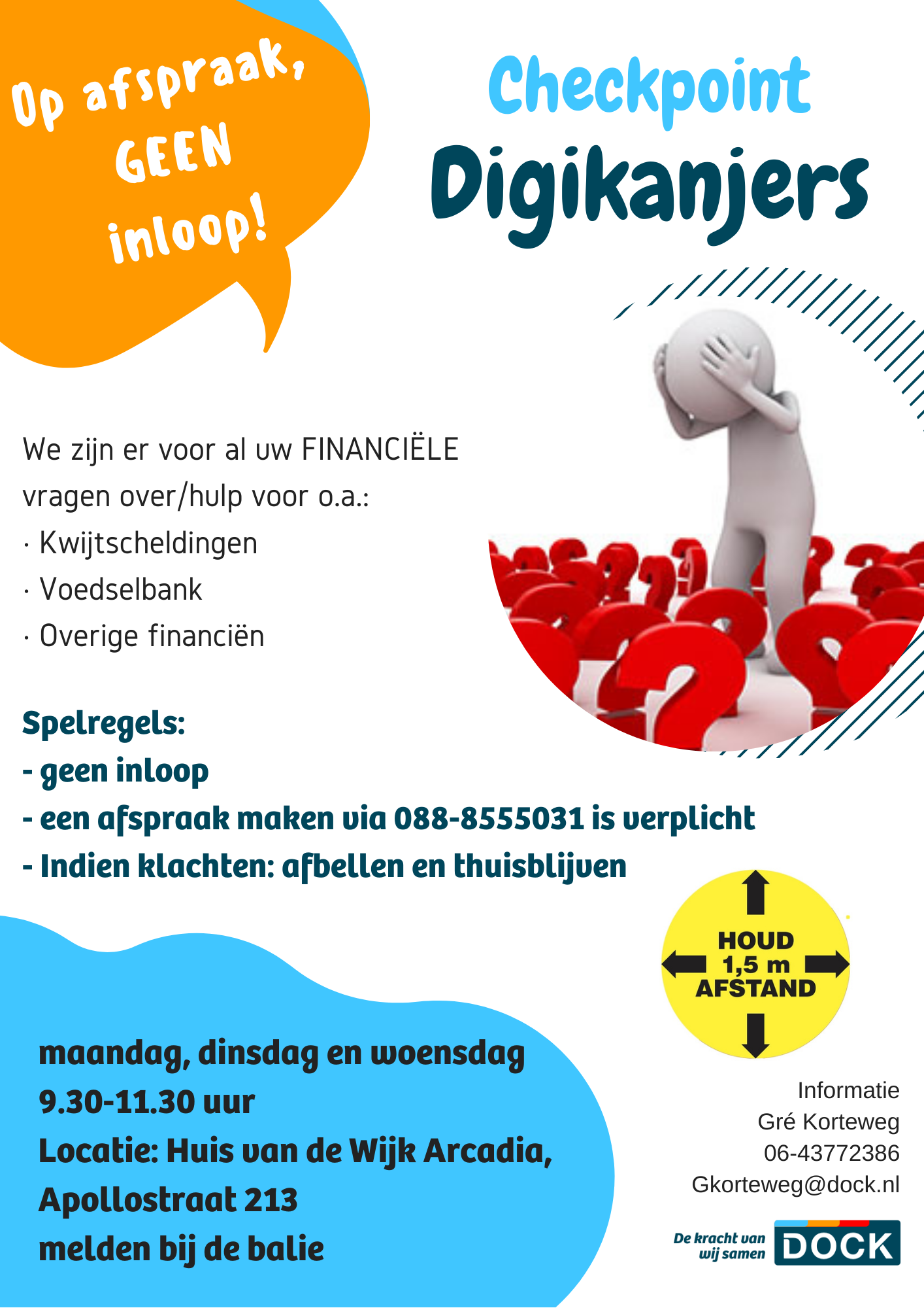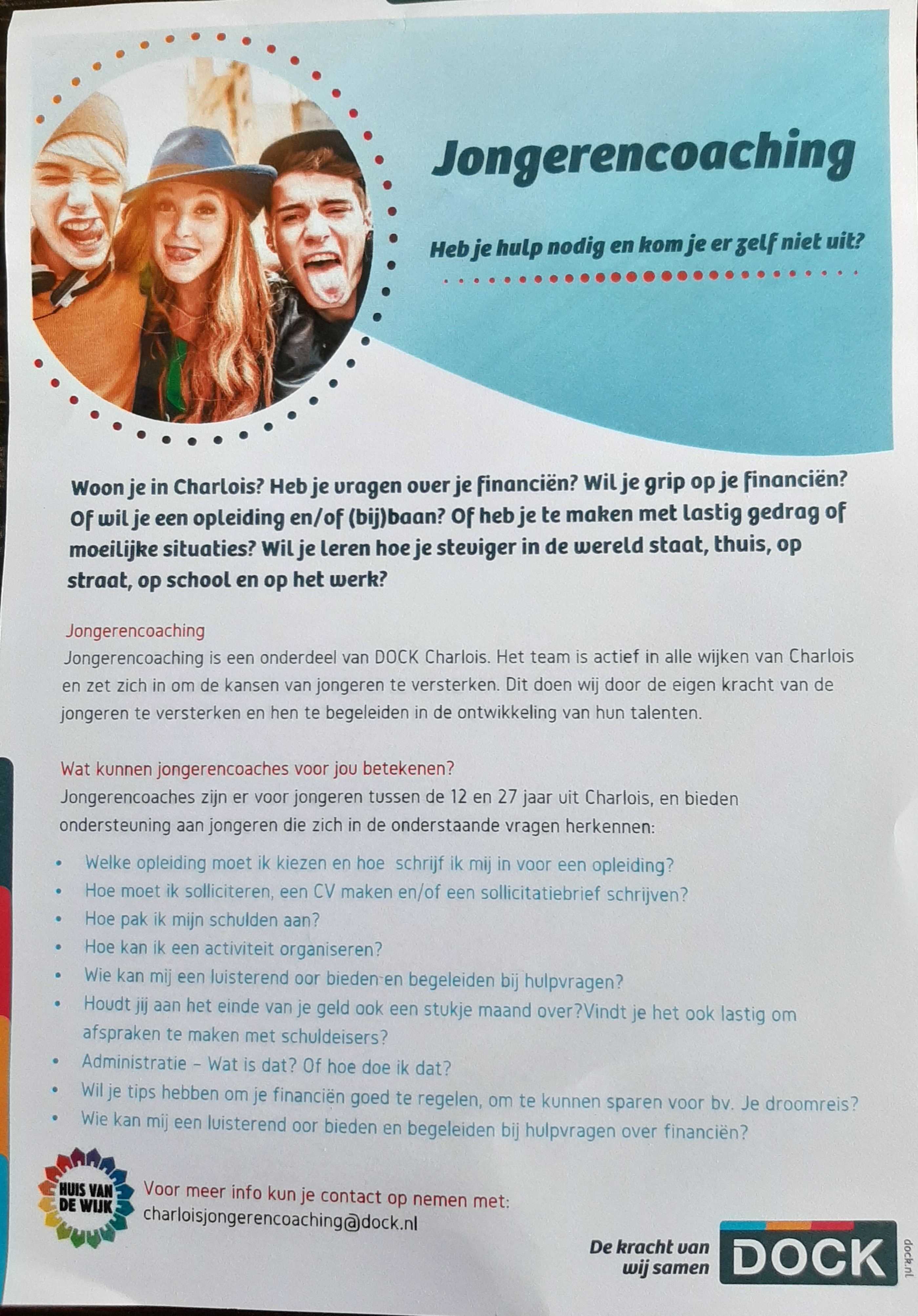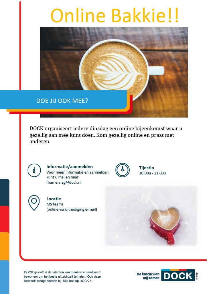 Ook voor levensvragen of praktische hulpvragen kunnen bewoners terecht bij DOCK. We luisteren goed en ondersteunen op maat in het zoeken naar oplossingen. Dit doen we zoveel mogelijk met een mix van groepsaanbod, de inzet van vrijwilligers en als ’t nodig is, individuele coaching. Onze activerende aanpak is altijd gericht op het zelf (kunnen) doen. Waardoor iemand (weer) perspectief ziet. Kijk voor meer informatie op onze website