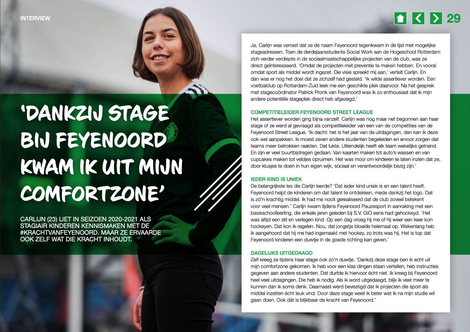 Feyenoord is de club die voor iedereen bereikbaar is en midden in de samenleving staat, een club die haar omgeving beter wil maken. Vanuit deze visie voert Feyenoord al jaren een breed maatschappelijk beleid voor diverse doelgroepen, welke gericht zijn op de pijlers; Sportparticipatie, gezondheid, talentontwikkeling en het stimuleren van de sociale cohesie. Binnen dit beleid biedt Feyenoord jaarlijks stageplaatsen aan studenten Social Work, binnen de profielen JEUGD en WELZIJN & SAMENLEVING waar jij jezelf optimaal kan ontwikkelen in een leerzame en uitdagende leeromgeving! Word jij al nieuwsgierig?