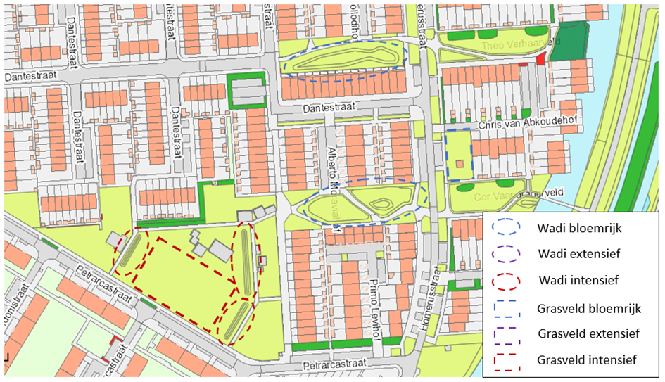 Het is bekend dat de begroeiing van een groenblauwe infiltratievoorziening belangrijk is voor de infiltratiecapaciteit, in Rotterdam worden veruit de meeste wadi’s toegepast met grasbegroeiing. Echter is het onderhoud zeer bepalend voor het type gras dat zich ontwikkeld, dit gaat van ‘grasfalt’ (20x-26x maaien per jaar) tot bloemrijk grasland (2x maaien per jaar).