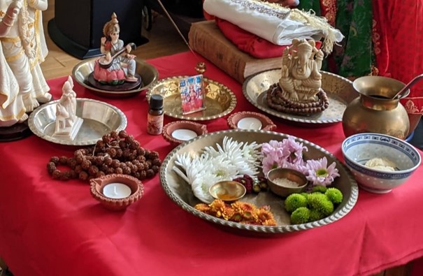 At Zinah's home, a puja (a form of prayer) is performed in which a mantra is recited to Lakshmi Mata, and they bless each other. The altar with murtis (figurines of gods) is decorated with flowers and Persad (sweets) is offered. On the altar, you can also find prayer blankets from her Nani (maternal grandmother) and Adjie (paternal grandmother) to honor them as seen in the picture.