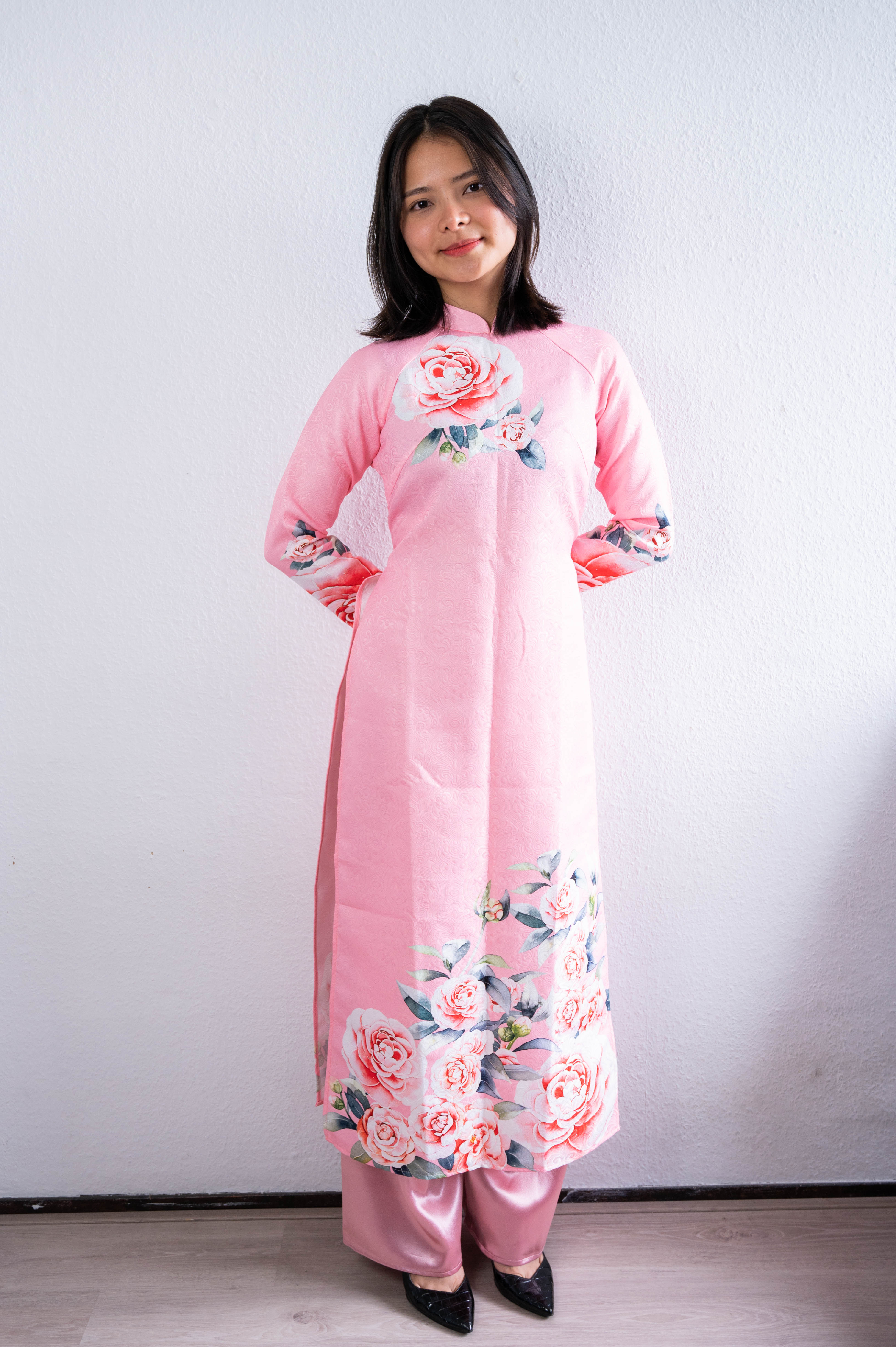 Ao dai betekent ‘lange jurk’ en symboliseert niet alleen een traditioneel Vietnamees kostuum, maar ook de glorieuze Vietnamese cultuur van gratie, bescheidenheid en schoonheid. Er zijn veel verschuivingen in ontwerpen en kleur, maar de jurk volgt het typische tweedelige ontwerp van een goed passende tuniek van volledige lengte met een hoge kraag die vanaf de taille in een voor- en achterpaneel splitst.