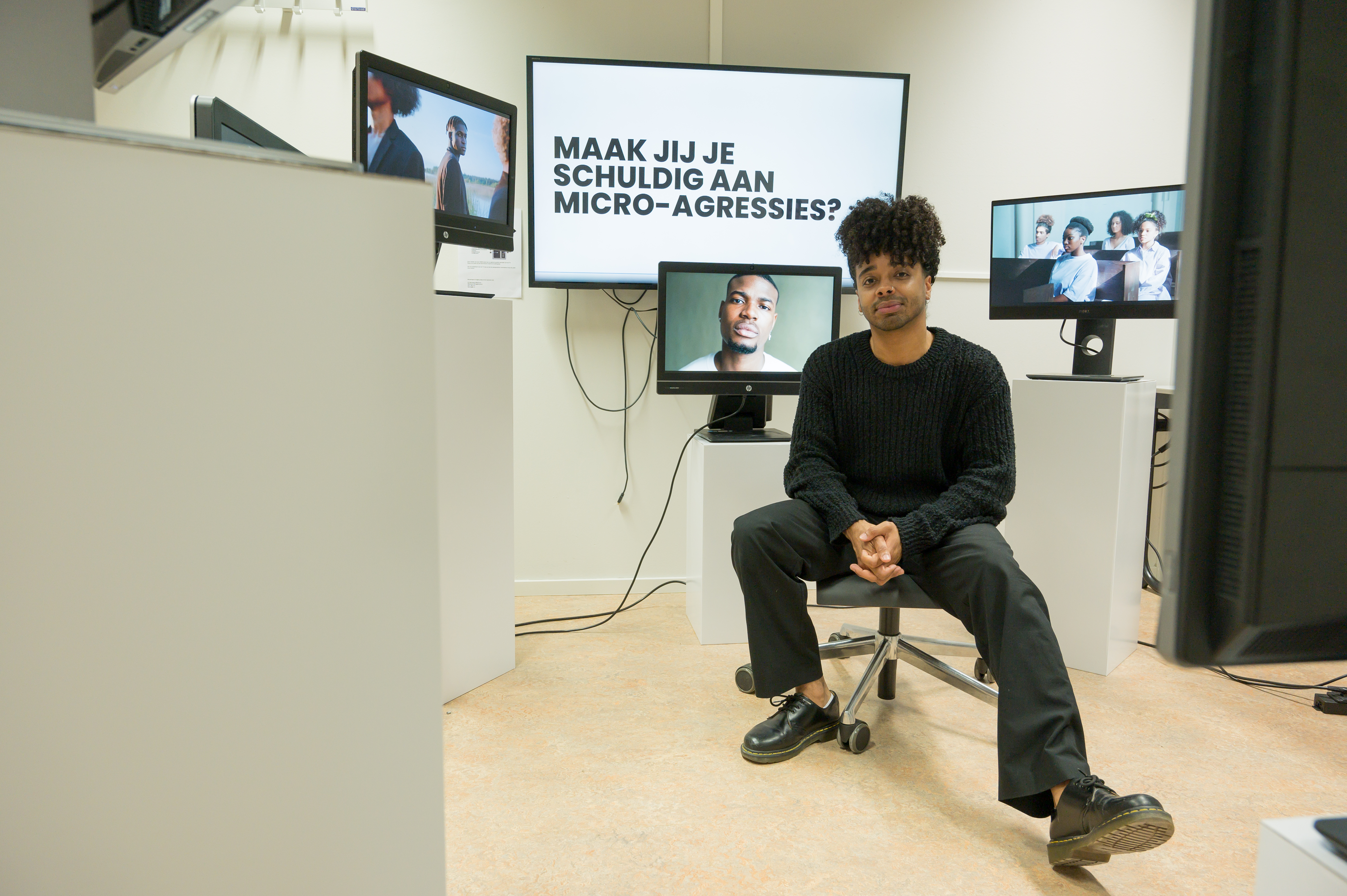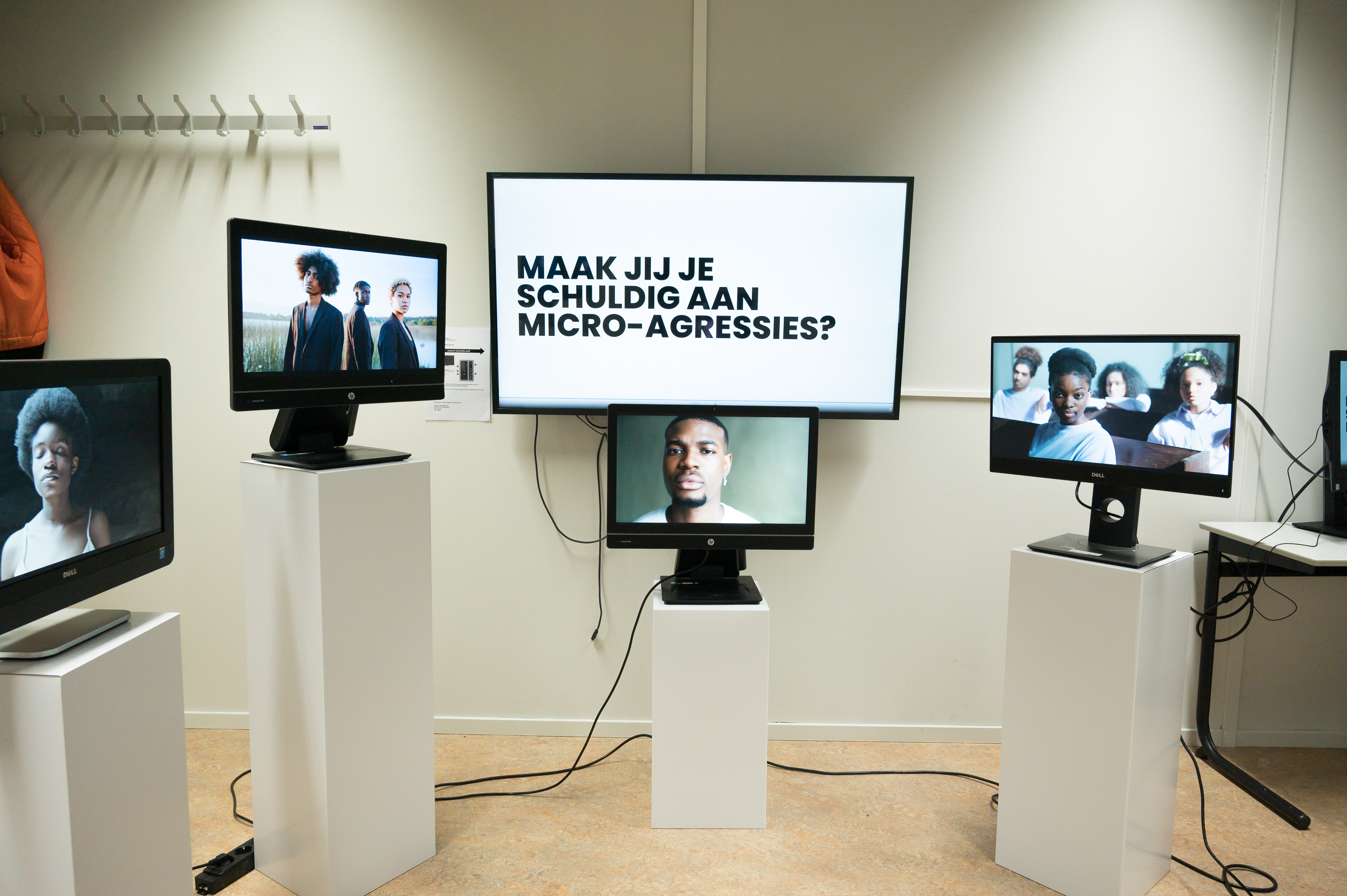 "In mijn werk heb je verschillende lagen met voice-over, de flitsen staan voor de microagressie en het gepiep is dat wat onbewust bijblijft. Dat wat je later nog terug gaat horen, net zoals dat is bij microagressie. De schermen staan in een cirkel met in het midden een lage stoel.