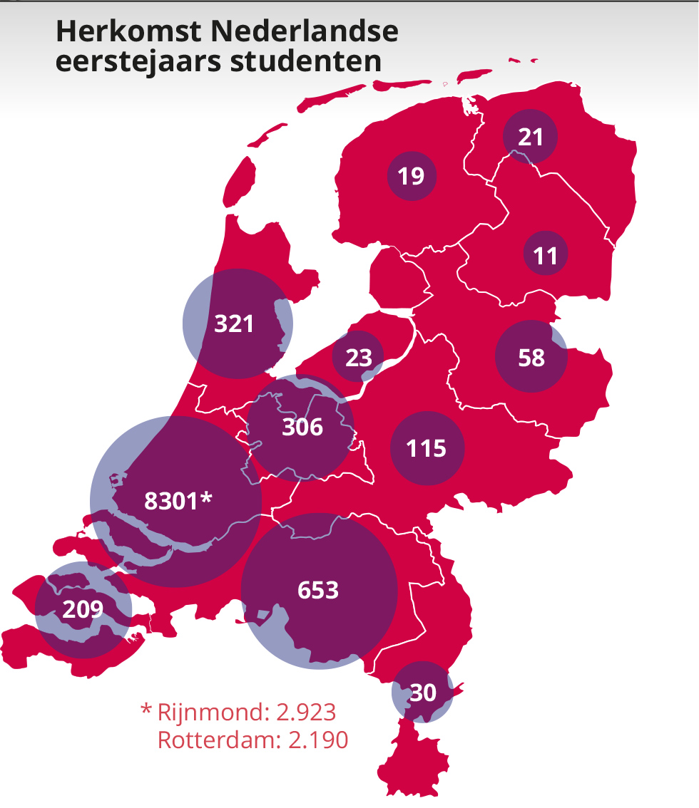Komen de studenten van onze hogeschool alleen uit Rotterdam en omstreken? Dat zou je misschien denken. Op deze kaart is te zien dat onze studenten uit heel Nederland komen, tot Groningen en Limburg aan toe.