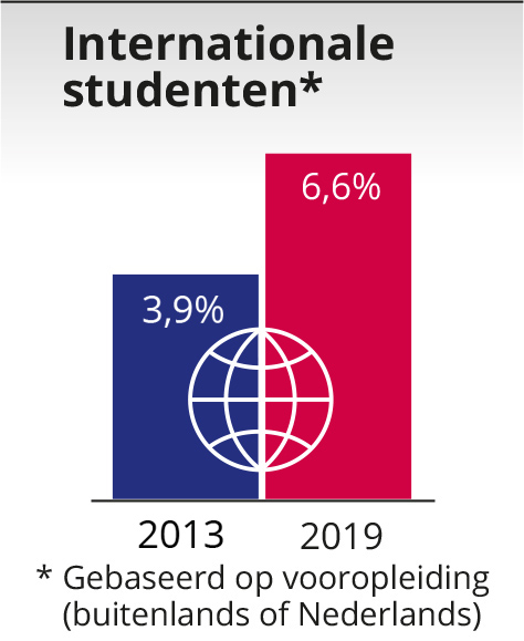 En dat niet alleen. Een snel groeiend percentage van onze studenten komt uit het buitenland. In 2019 maar liefst 6,6% van het totaal. Havo is de meest genoten vooropleiding van onze studenten. Daarna volgt het mbo. Een beperkt deel van onze studenten heeft vwo gedaan.