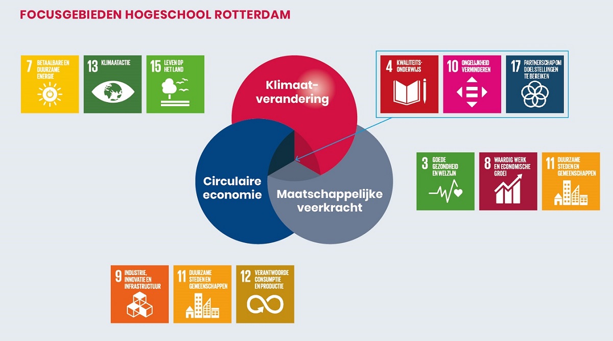 Drie focusgebieden staan centraal in onze aanpak: Maatschappelijke veerkracht, Klimaatverandering en Circulaire economie. Vanuit verbinding en samenwerking werken we aan deze thema's; we verbinden onderwijs aan onderzoek, onderzoek aan onze bedrijfsvoering, studenten aan lectoren, externe partners aan docenten enzovoorts. Daarnaast is elk van de thema's verbonden met een aantal van de Sustainable Development Goals, welke dat zijn is te zien op de themapagina's hieronder.