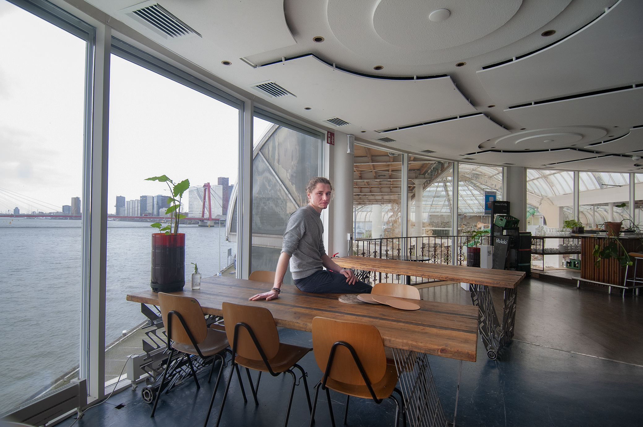 Na zes weken lag er een volledig nieuw product op de tekentafel. “Linoleum heeft het kenmerk dat het flexibel is. Na onze bewerking van de reststroom kwamen we uit op iets dat qua uiterlijk op linoleum lijkt, maar dan volledig hard en stijf”, zegt derdejaars Jaromir, terwijl hij in Blue City op de houten bar tikt. “Hiervoor zou je het uitstekend kunnen gebruiken. Uiteindelijk hebben we een lamp ontworpen, vooral omdat het niet te complex was om binnen zes weken te realiseren.”