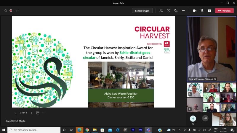 Met hun project over het alternatieve menu sleepten César en Youri de tweede prijs in de wacht van de Circular Harvest Innovation Award, een cadeaubon voor een diner in het Aloha Low Waste Foodcafé, niet toevallig gevestigd in de circulaire hub Blue City waar ook het event werd gehouden. Hun presentatie maakte deel uit van het ‘Impact Café’, een maandelijks event over duurzaamheid dat samenwerkingspartners Blue City en Hogeschool Rotterdam samen organiseren, en onderdeel van het dagprogramma. Daarnaast waren er keynotes en workshops. Maar tijdens Circular Harvest staan vooral de studenten centraal, in totaal presenteerden 15 projecten zich.