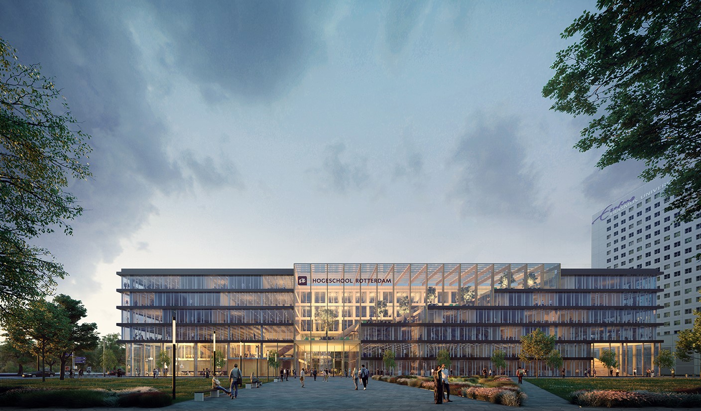 In een tijd waarin het onderwijs vanwege het coronavirus op afstand wordt aangeboden en de gebouwen grotendeels leeg staan, kijkt Hogeschool Rotterdam ook vooruit. Zij bouwt op de locatie Kralingse Zoom een inspirerende en duurzame onderwijsomgeving, waar straks de beste economen en bedrijfskundigen van de toekomst worden opgeleid. Woensdag is het ontwerp van dit nieuwe gebouw online bekend gemaakt: een duurzaam, flexibel gebouw met een opvallende grote glazen gevel, ontworpen door Paul de Ruiter Architects. Studenten dachten mee over hoe de nieuwe school eruit moest komen te zien.