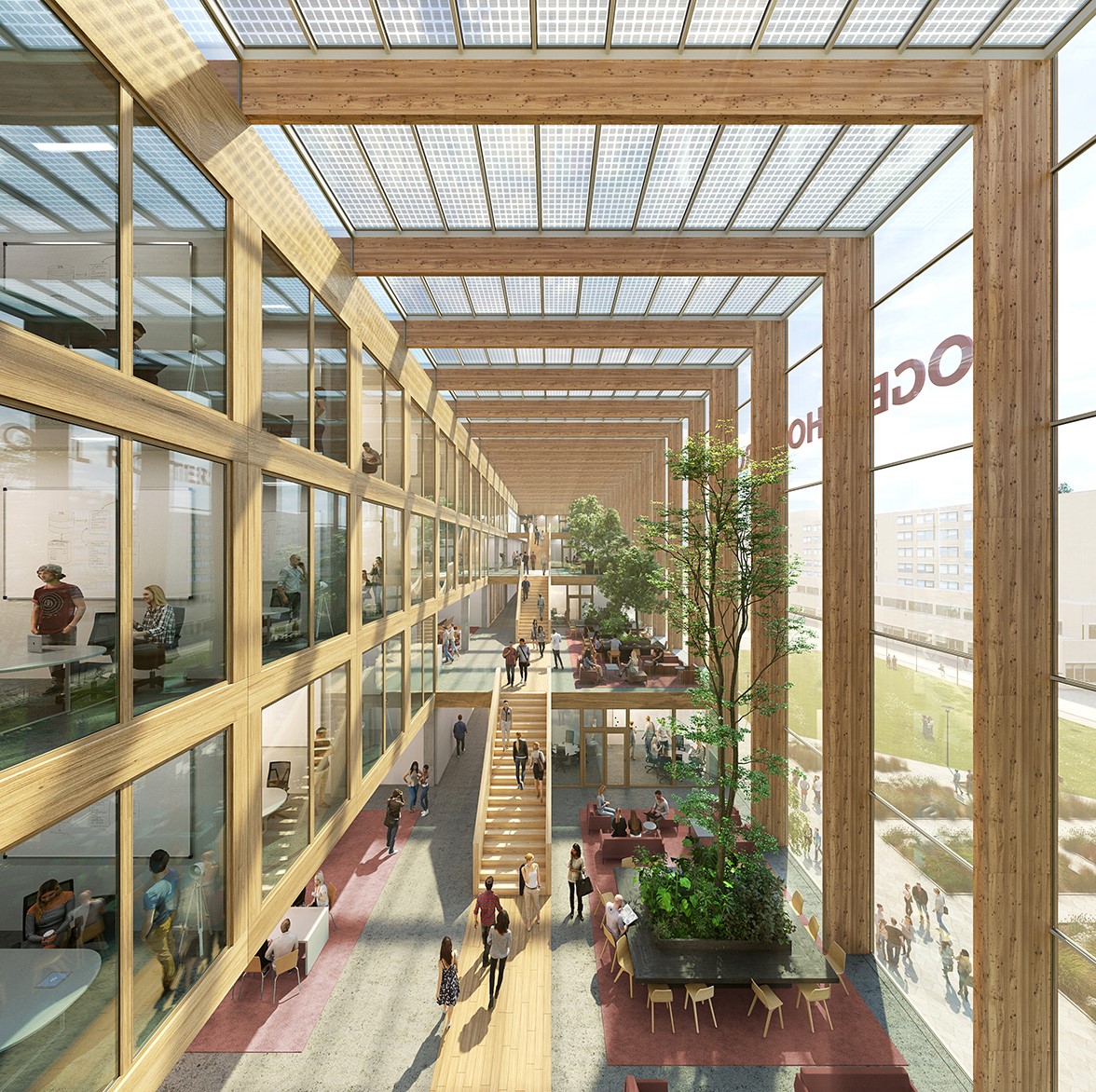 In het ontwerp staan verder openheid en verbinding centraal. Het gebouw valt op door een groot trapsgewijs oplopend glazen atrium met een robuuste houtconstructie aan de noordgevel en de monumentale hoofdentree. De houten trappen liggen direct aan de glazen gevel van het atrium en verbinden de verschillende verdiepingen en studiepleinen van het gebouw. De wand van het atrium wordt gevormd door verschillende transparante projectruimtes die, net als de trappen, een uitzicht bieden op campus. Omgekeerd geeft de transparante gevel vanaf de campus vrij zicht op de beweging en uiteenlopende activiteiten die zich in het gebouw afspelen. Het transparante karakter van het gebouw haalt de buitenwereld binnen en brengt de binnenwereld een beetje naar buiten.
