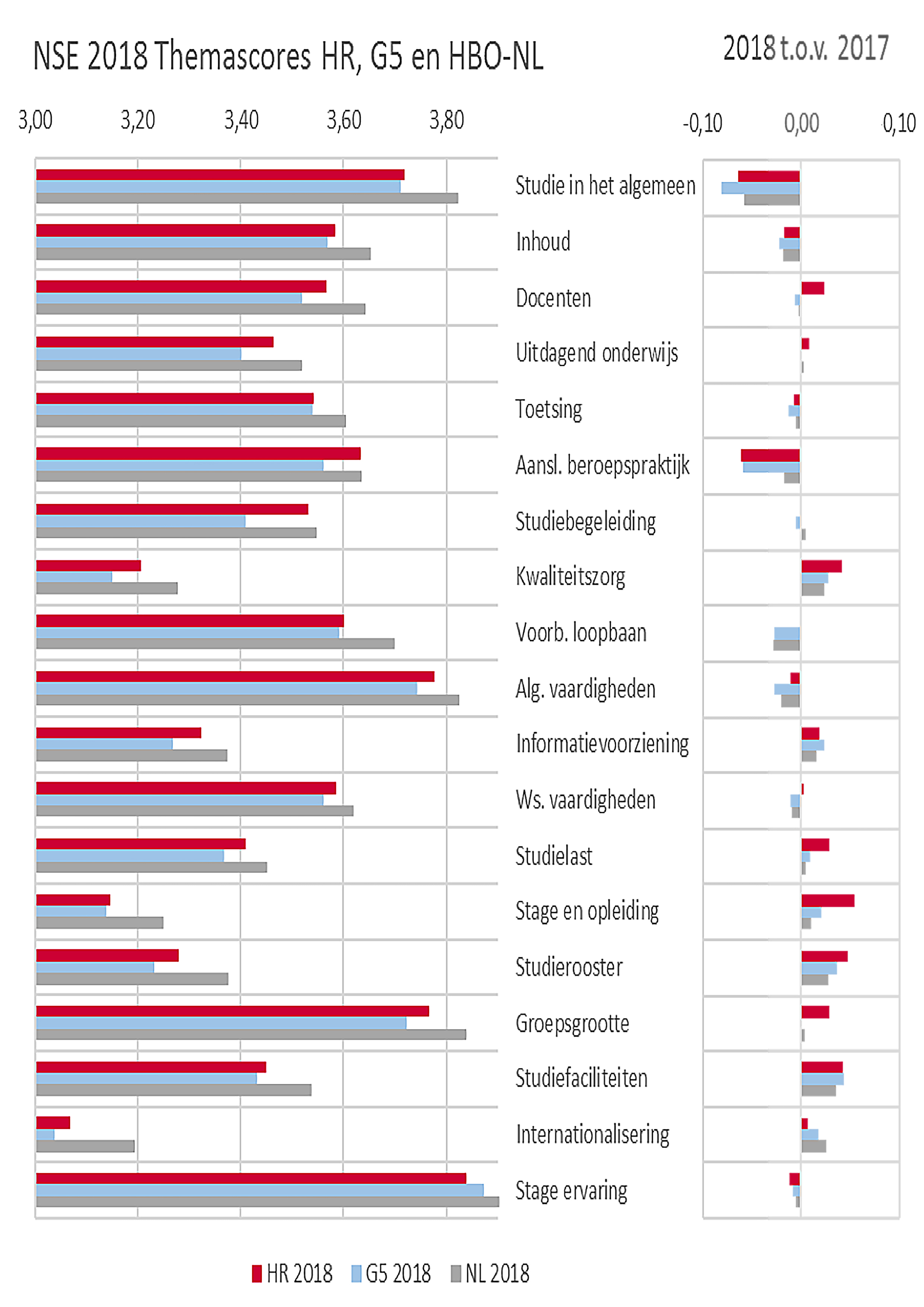 Figuur: Themascores Hogeschool Rotterdam (HR), de 5 grote hogescholen (G5) en het hbo in heel Nederland (NL 2018). Update 9 juli.
