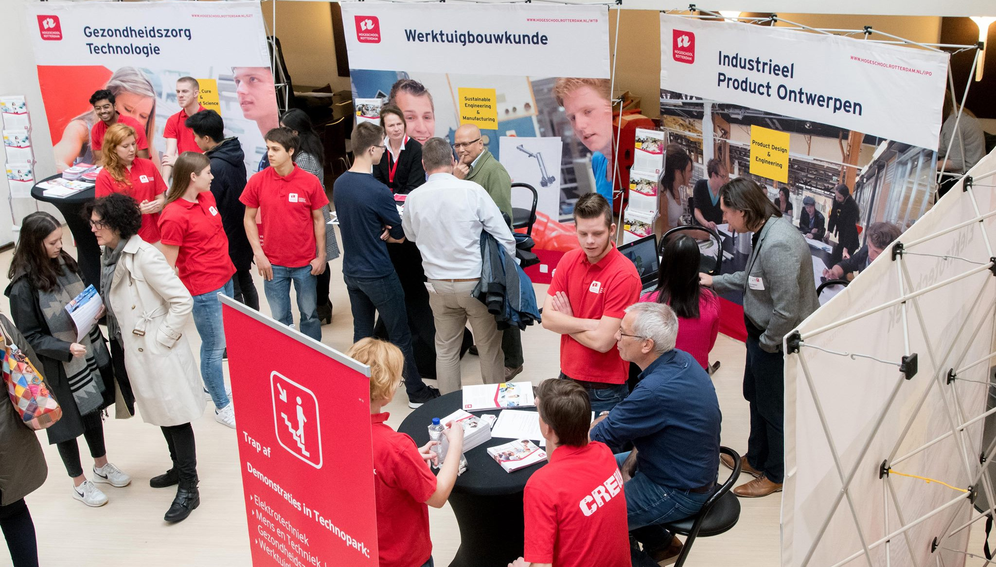 Het mooiste vind ik steeds de wisselwerking tussen de toekomstige studenten en hun ouders. Ouders zijn heel belangrijk in het keuzeproces van hun kinderen, maar moeten hun interventies zorgvuldig plegen. Ik weet dat als vader van drie zonen als geen ander en weet ook niet goed of het mij altijd lukt. Goed doseren en timen zijn van groot belang. Ik vang flarden van gesprekjes op die dat illustreren: “Nee, mam, daar ga ik echt niet naar kijken”. Of dat prachtige beeld van die net iets te enthousiaste vader of moeder in gesprek met een collega: “Mooi, hè, Erik, kijk hoe dat werkt”. Aan de puberaal-afwezige blik van Erik zie ik dat het deze opleiding niet gaan worden. En toch is ook dit gesprekje belangrijk, als het Erik tenminste aanzet net wat beter na te denken hoe hij zijn toekomst ziet en welke keuzes hij dan moet maken.