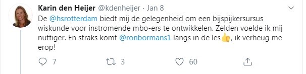 Mbo-studenten die bij ons Informatica of Technische Informatica studeren, krijgen bijles wiskunde. Extra oefenen in het basiskamp. Op het programma staan de tweedegraadsvergelijkingen, in het bijzonder de abc-formule. Mijn favoriete wiskunde. Het heeft iets elegants. Overigens, niet die abc-formule, dat is een truc die je kunt toepassen zonder te weten wat je doet. Maar elegant is wel het ontbinden in factoren. Dat je van x² + 6x + 5 = 0 naar (x+5) (x+1) = 0 kunt gaan, waarmee de oplossing van de vergelijking in beeld komt. Docente Karin den Heijer plaatste eerder op de dag een tweet die veel zegt.
