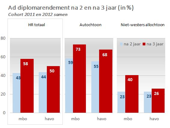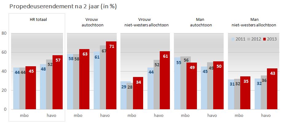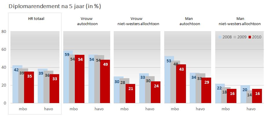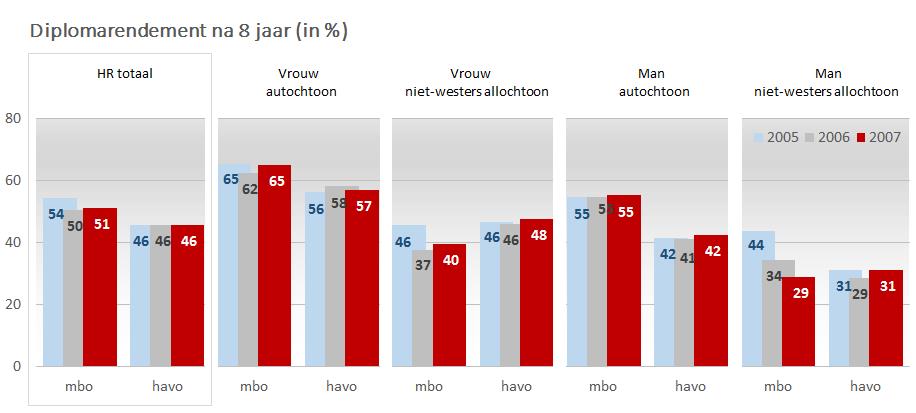 Positief verschil ten opzichte van vorig jaar is de stabilisatie van het rendement bij autochtone vrouwen afkomstig van het mbo en een lichte stijging bij niet-westers allochtone mannen met een havo vooropleiding – de groep die het het moeilijkst heeft. De andere groepen havisten gaan echter wel omlaag – dat was vorig jaar nog niet te zien. Bij niet-westers allochtonen is het rendement van mbo’ers al lager dan bij havisten. Bij autochtonen is het rendement van mbo’ers nog steeds hoger dan dat van havisten.