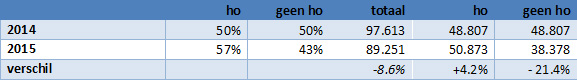 Dan de hogescholen, altijd al de sector in het hoger onderwijs met veel meer studenten waarvan ouders minder hoog opgeleid zijn en een lager inkomen genieten dan die van de universitaire studenten. We gaan eerst een jaartje terug, naar april 2016 wanneer ResearchNed in de Monitor Beleidsmaatregelen 2015 de (relatieve) cijfers presenteert over de herkomst van studenten naar het opleidingsniveau van hun ouders. Die relatieve cijfers kunnen dan worden herleid tot het volgende plaatje. Achter de grote daling in 2015 ten opzichte van 2014 gaan twee verschillende ontwikkelingen schuil. Het aantal studenten met tenminste één ouder met een ho-diploma stijgt met 2.066, terwijl het aantal studenten waarvan geen van beide ouders een ho-diploma heeft, daalt met 10.429. Deze cijfers laten het gelijk zien van de analyse van de Onderwijsinspectie over gelijke kansen.