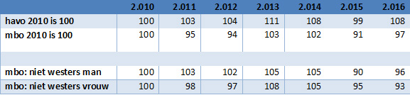 Om te kunnen vaststellen of de gelijke kansen in de toegankelijkheid tot het hoger beroepsonderwijs geborgd zijn, moet je dus niet alleen kijken naar de totalen, maar ook naar wat er achter schuil gaat. Laten we eens kijken wat dat in 2016 oplevert. Ook hier zien we dat er achter de totale cijfers werelden van verschil schuil gaan. We maken daarbij gebruik van de cijfers op de kennisbank van de vereniging hogescholen. Bij de havisten zien we inderdaad een fiks herstel, bij de mbo’ers is dat niet het geval en de instroom van vrouwelijke mbo’ers met een niet-westerse achtergrond staat extra onder druk.