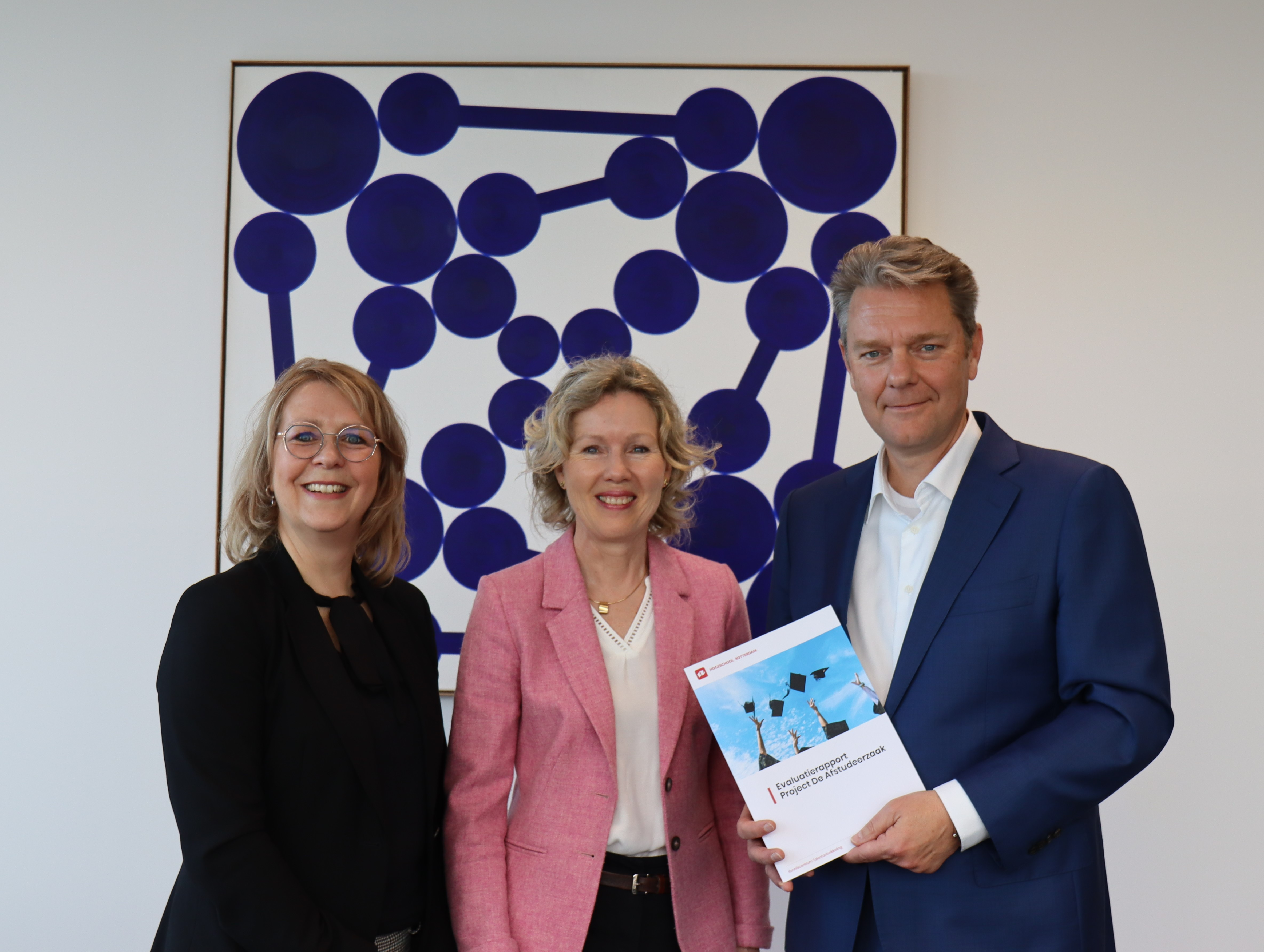 Op dinsdag 15 maart werd het onderzoeksrapport “Project De Afstudeerzaak” over de opbrengsten van het werken met De Afstudeerzaak door Astrid en Cora officieel overhandigd aan Fred Feuerstake, directeur HRBS. Het rapport is opgesteld om beter inzicht te krijgen in de resultaten die De Afstudeerzaak oplevert. Uit het onderzoek blijkt dat het bieden van aanhoudende steun, structuur en monitoring de belangrijkste succesfactoren van De Afstudeerzaak zijn. Ook aandacht voor persoonlijk welzijn en de tijd die de begeleiders steken in de contacten met de langstudeerders heeft een nadrukkelijk positief effect op het studiesucces.