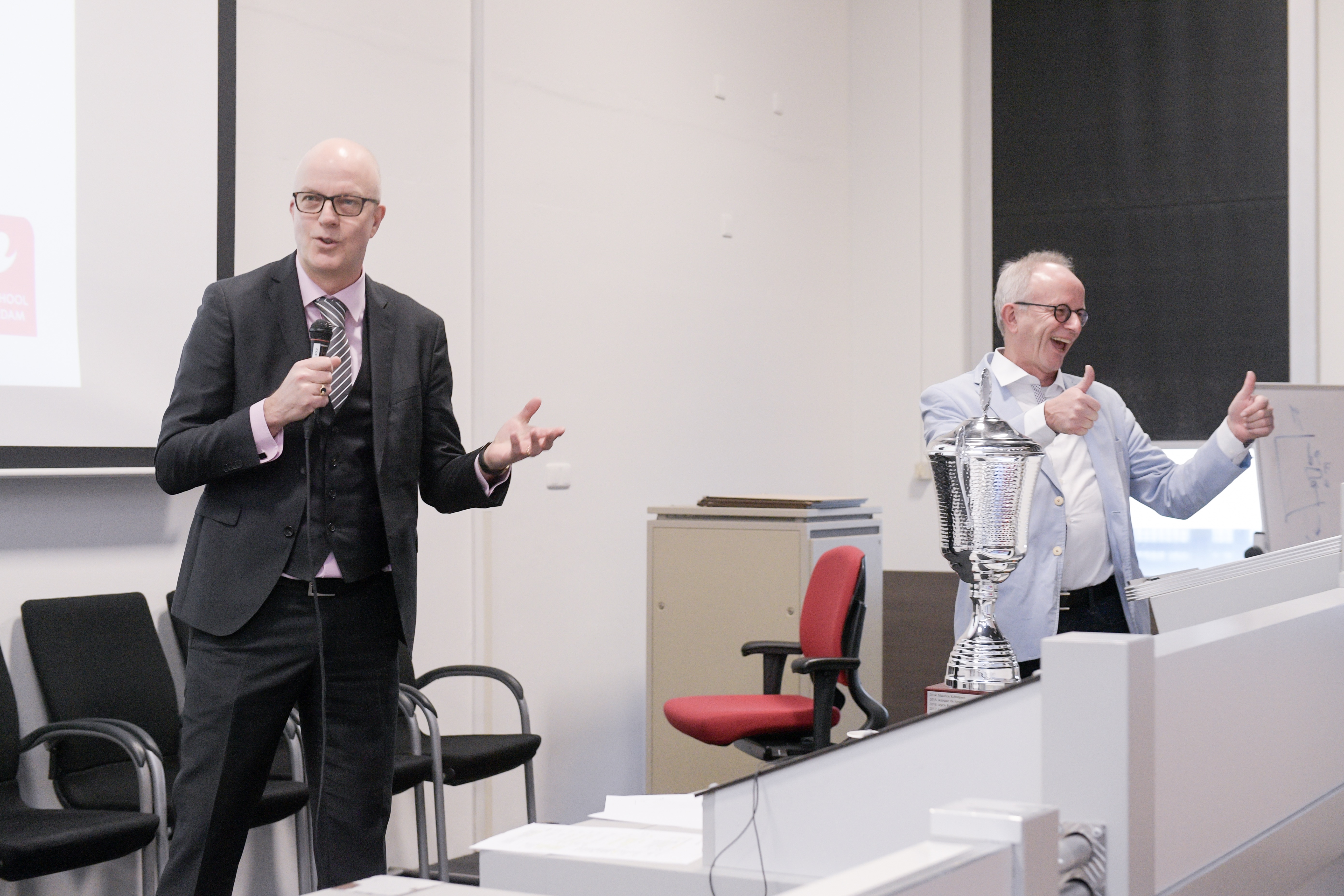 Die opmerking was koren op de molen van Ron Bormans. De collegevoorzitter van Hogeschool Rotterdam was uiteraard bij de prijsuitreiking aanwezig en probeerde een deal te sluiten met de studenten in de collegezaal. “Laten we een schema opstellen, zodat jullie vannacht om de vijf minuten een telefoontje naar Martin plegen. Dat is het ultieme eerbetoon…” Martin keek de zaal in met een blik van: waag het eens!