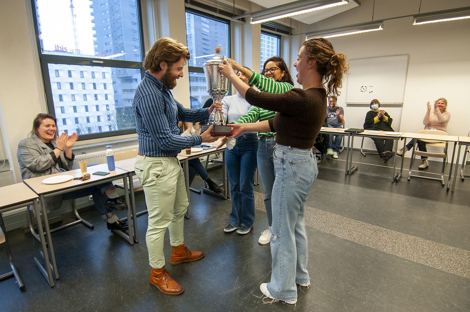 De winnaar is naar een overleg met zijn mededocenten gelokt en als hij zijn drie stagestudenten voorbij ziet lopen, weet David eigenlijk al genoeg. Ook Oleksandra Davydenko en Adil Bouchekourte van de studentengeleding van de medezeggenschapsraad (SGMR), organisator van de verkiezing, stappen het lokaal binnen om de winnaar bekend te maken.