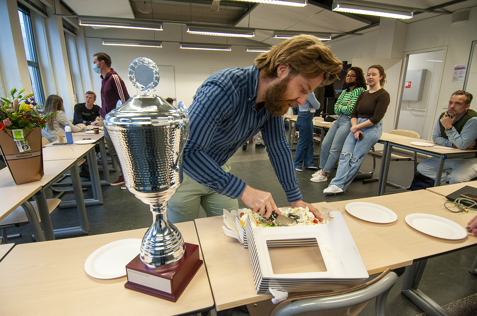 Intussen heeft course leader Patrick van der Gaag een taart tevoorschijn getoverd, die winnaar David mag aansnijden en uitdelen aan zijn collega’s. “Ik heb er even over kunnen nadenken en ik geef die grote beker een plekje in de docentenkamer. Ik word nu in het zonnetje gezet, maar ons team bestaat uit alleen maar leuke docenten. We zijn het niet altijd met elkaar eens, maar daardoor halen we juist het beste in elkaar naar boven.” Met een knipoog: “Maar ik ben natuurlijk de leukste.”