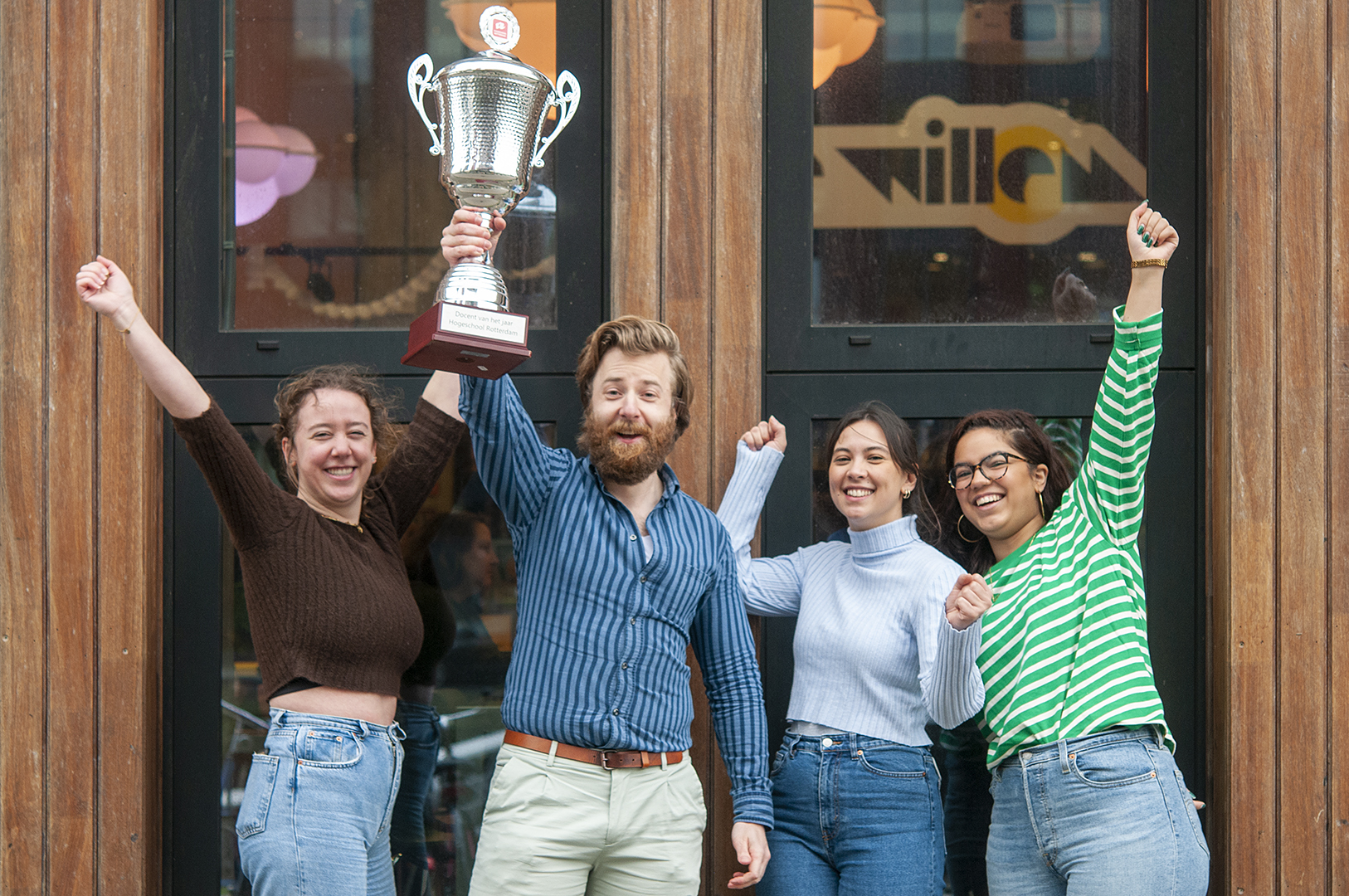Teddy Quatfass, Julia Zwart en Tessa Bosman lopen de trap van de Willem de Kooning Academie op. “Zou hij iets in de gaten hebben”, vragen de derdejaarsstudenten Leisure & Events Management zich af. Ze hebben de enorme wisselbeker voor de Docent van het Jaar bij zich, want hun docent David de Prez is in de prijzen gevallen. “Het staat op zijn bucketlist”, lacht Julia. “En als ik een vraag stel, zegt hij altijd voor de grap dat ik hem dan wel moet nomineren voor de verkiezing Docent van het Jaar”, zegt Tessa.