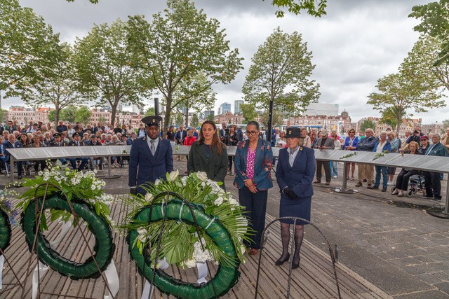 Senior beleidsadviseur Aida Tunovic en collegelid Zakia Guernina (in het midden v.l.n.r.) leggen namens Hogeschool Rotterdam een krans.