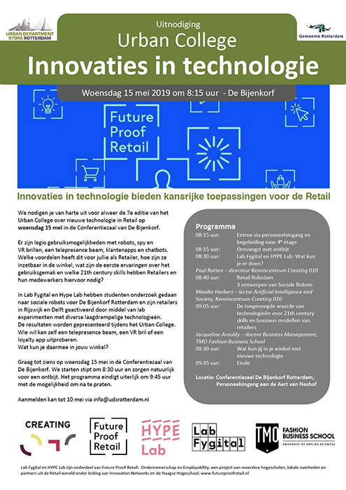 In Lab Fygital en Hype Lab hebben studenten onderzoek gedaan naar sociale robots voor De Bijenkorf Rotterdam en zijn retailers in Rijswijk en Delft geactiveerd door middel van lab experimenten met diverse laagdrempelige technologieën. De resultaten worden gepresenteerd tijdens het Urban College. Wie wil kan zelf een telepresence beam, een VR bril of een loyalty app uitproberen. Wat kun je daarmee in jouw winkel?