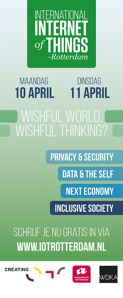 Op 10 en 11 april vindt de zesde editie van International Internet of Things Rotterdam plaats. Het centrale thema van dit tweedaagse congres is 'Wishful world, wishful thinking?'. Het programma is gericht op docenten, studenten, ondernemers, beleidsmakers, experts en onderzoekers van binnen en buiten Hogeschool Rotterdam. Naast een tien uur durende Hackathon laten vooraanstaande experts en onderzoekers hun licht schijnen over aspecten van het 'internet of things'.