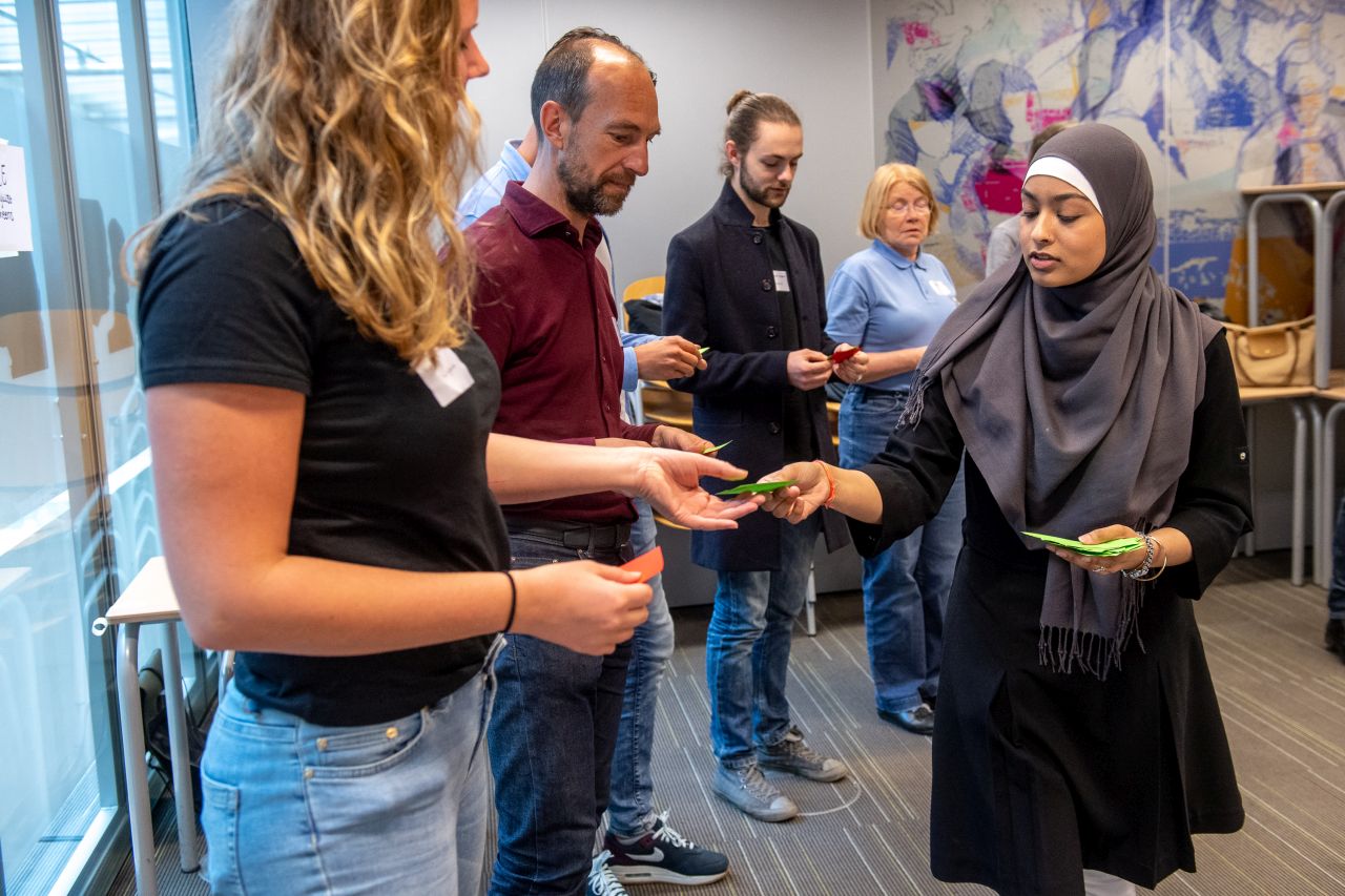 Wie mee wilde doen aan de interactieve workshop Het versterken van veerkracht op de Willem de Kooning Academie werd bij binnenkomst getrakteerd op chocoladecake of baklava. Met een doel, want het bleek een testje. “Wie heeft er bij binnenkomst een opmerking gemaakt over het eten dat hij of zij kreeg aangeboden? En gaf dit een goed gevoel?” Eten blijkt voor vrijwel iedereen een prima middel om in te spelen op het groepsgevoel. Acht studenten deden onderzoek naar psychische kwetsbaarheid bij hen op school en presenteerden hun bevindingen tijdens deze afwisselende workshop. Onderwerpen als prikkelbaarheid, jonge mantelzorgers en feedback werden op creatieve wijzen verlevendigd en toegepast op de deelnemers. Dat leverde soms bevestiging op, maar vaak ook een nieuwe kijk op dingen. Wat op school als een inspirerende ruimte wordt gezien, zien sommigen als overprikkeling. Hoe ga je hier als opleiding mee om?