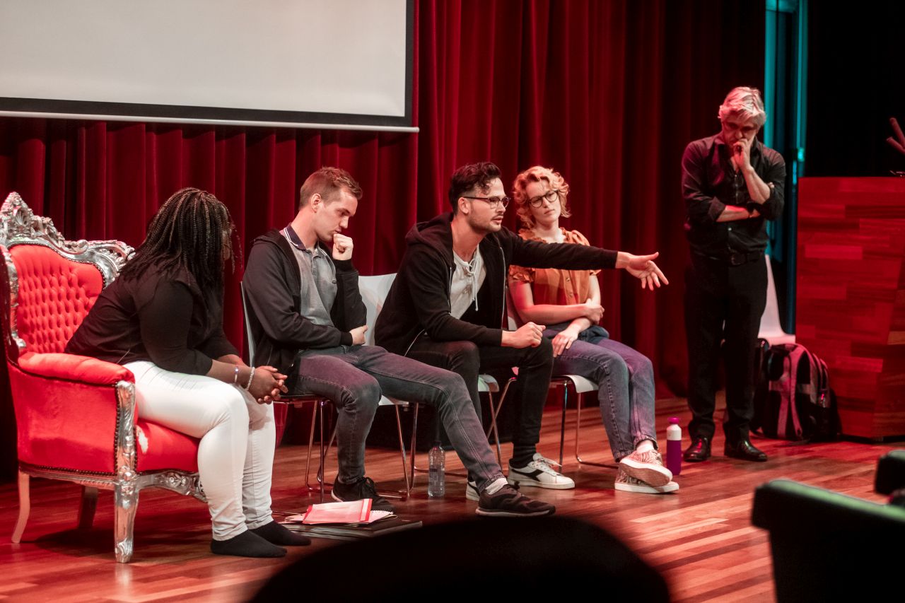 Zie hier het algemene verhaal van de Koplopers. Koplopers is een project gericht op de bevordering van participatie van jongeren met psychische kwetsbaarheid aan het onderwijs (hbo, mbo), welzijn en bij het vinden van werk. Ervaringsdeskundige jongeren gaven samen met Hogeschool Rotterdam, Hogeschool Inholland en de gemeente Rotterdam vorm aan de ontwikkeling en uitvoering. Afgelopen vrijdag 14 juni volgde de slotconferentie van dit project op de locatie Hogeschool Inholland. In de setting van een theatervoorstelling inclusief ‘talkshow’ stelden de jongeren zich voor met verhalen die soms het voorstellingsvermogen te boven gingen.