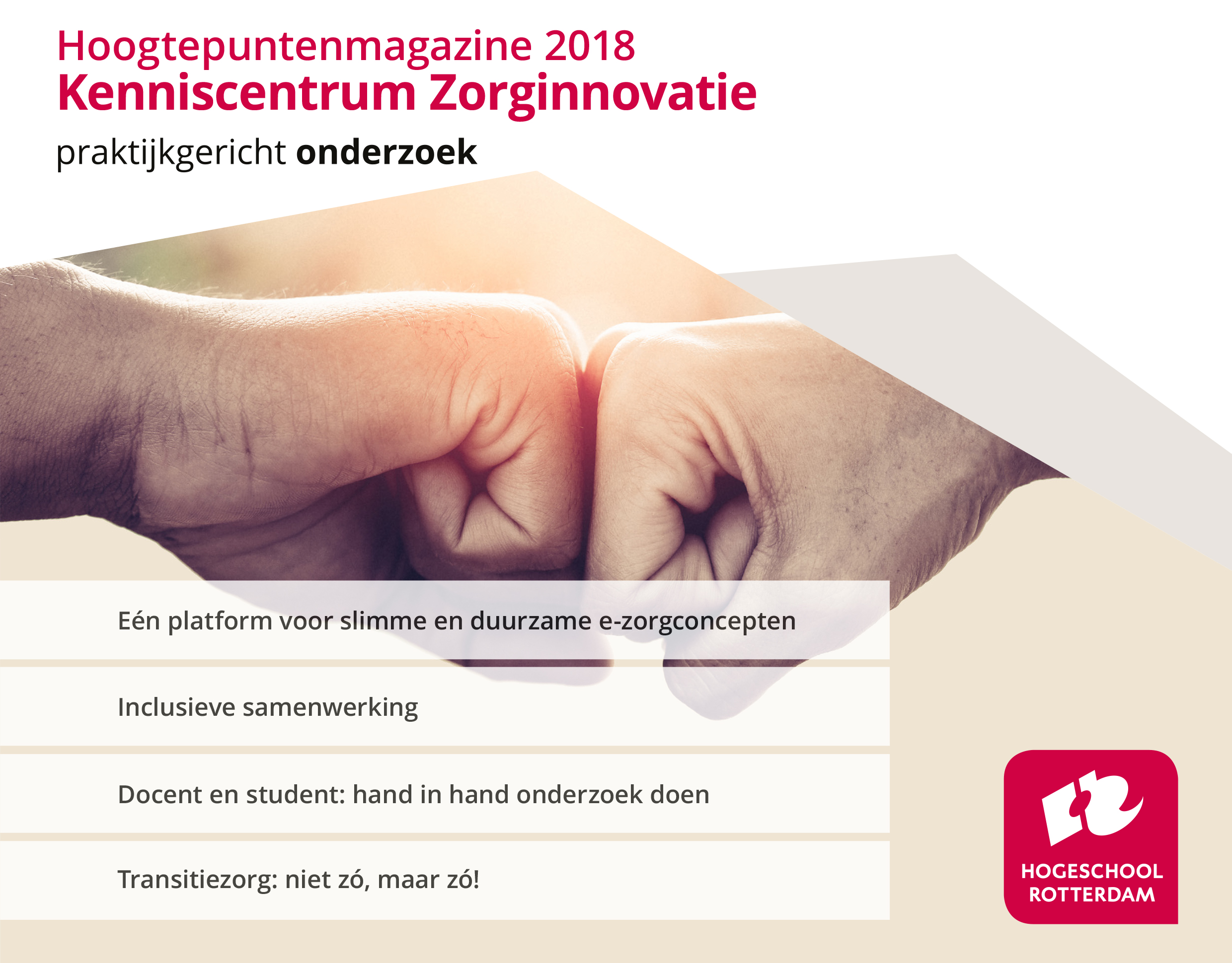 De kenniscentra van Hogeschool Rotterdam geven jaarlijks een magazine uit met de meest opvallende, inspirerende en impactvolle onderzoeksprojecten van Hogeschool Rotterdam. In onderstaand magazine zijn de hoogtepunten van Kenniscentrum Zorginnovatie te bekijken.