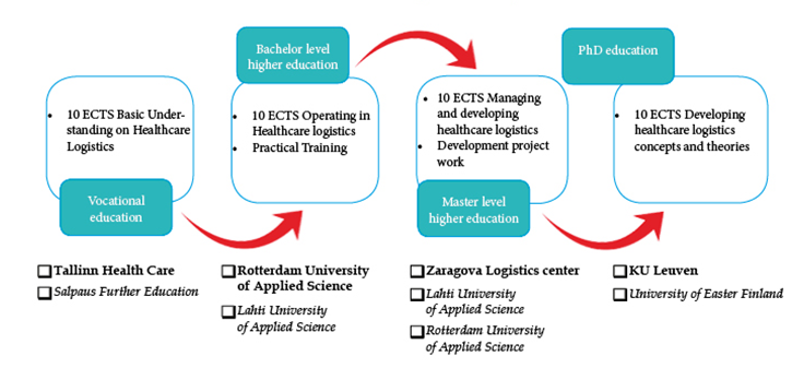 HELP staat voor Healthcare Logistics Education and Learning Pathway. Het doel van dit project is om met behulp van internationale kennisuitwisseling studiemodules te ontwikkelen van beroepsonderwijs tot en met het PhD-niveau. Maar de focus ligt ook op het creëren van een Europees netwerk van zorglogistiek. Samenwerkingspartners zijn universiteiten en hogescholen in Estland, Finland, België, Spanje en Nederland. Iedere partij heeft een specialisatie en ontwikkelt op basis van de gevraagde competenties een deel van de modules (zie afbeelding 1), die zowel theoretisch als praktisch van aard zijn. Deze modules worden tijdens de pilot weken internationaal uitgewisseld en getest. Aan de orde komen vraagstukken die samenhangen met de logistieke ‘belevingswereld’ van zorgprofessionals en studenten van een zorgopleiding, hebben ze bijvoorbeeld de juiste middelen op het juiste moment op de juiste plek liggen of kan de logistiek daarin nog efficiënter. Maar ook vragen rondom ligduur en bedbezetting komen aan de orde. Hierdoor is het voor logistieke professionals en studenten logistiek ook een interessant leerpad, want naast klassieke logistieke vraagstukken (o.a. voorraadbeheer) worden ook de specifieke kenmerken van de zorgcontext onderwezen.