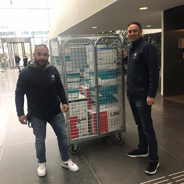 FIT-medewerkers Yusuf Bicakci en Ferdy Jonas bij het afgeven van de beschermingsmiddelen in het Erasmus MC.
