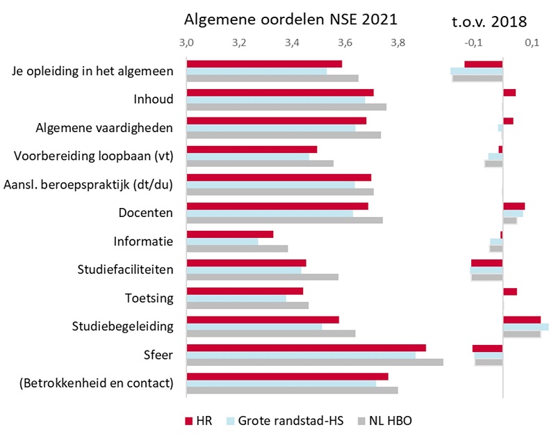 In de grafiek hieronder zijn de resultaten op de NSE 2021 van Hogeschool Rotterdam weergegeven en vergeleken met de resultaten van de grote randstadhogescholen en hogescholen in Nederland. Aan de rechterkant wordt NSE 2021 vergeleken met NSE 2018.