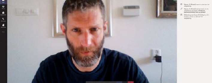 “Op een incidentele verstoring na gaat het erg goed. Wel merk ik dat het inspannender is dan lesgeven in de klas. Mentaal vooral. Je moet je goed concentreren en je kunt bijvoorbeeld de reacties minder goed zien. Mijn collega’s gaven het ook aan, na de eerste week waren we allemaal meer moe dan gewoonlijk. Sommige studenten geven aan dat dat ook voor hen geldt. Dat zal met de switch te maken hebben denk ik, het is een goede oplossing voor nu maar je moet er wel aan wennen.”