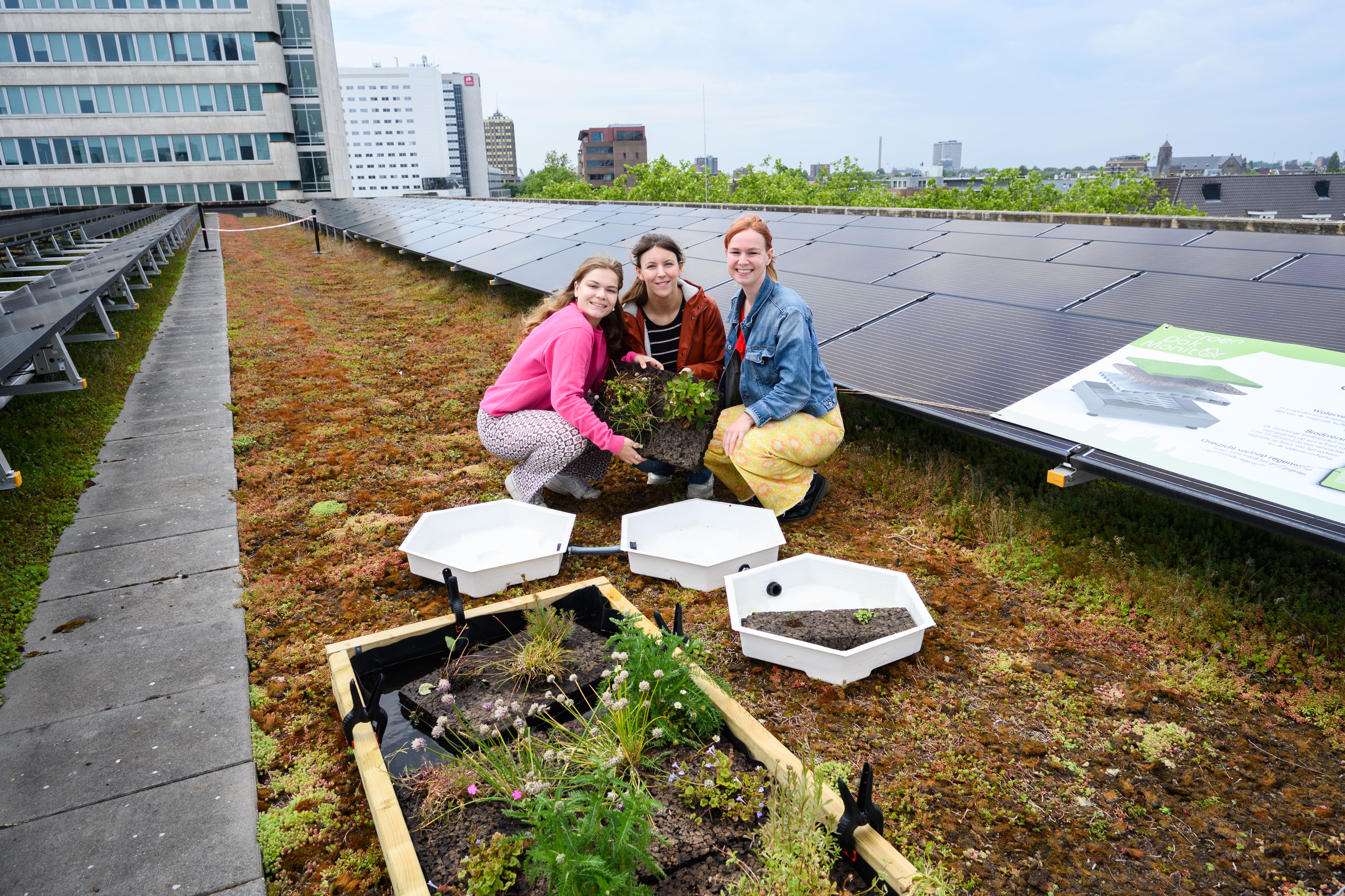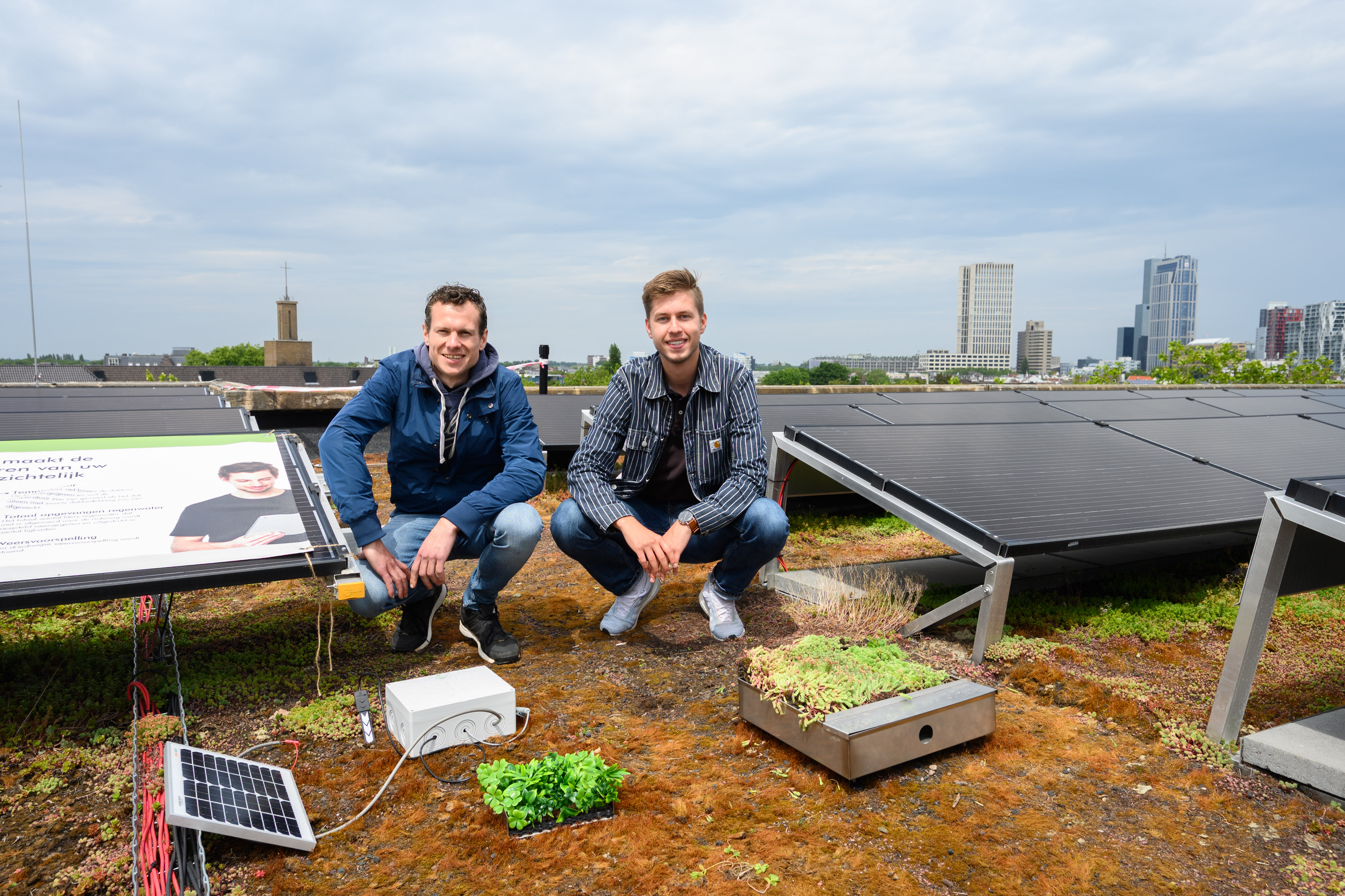 Een dak zie je meestal niet. Het is daarom lastig om te weten wat nodig is om een groen dak te verbeteren. Alumni Koen Bol en Paul Baart hebben hiervoor een oplossing bedacht. Koen: “Tijdens onze studie ontwikkelden we een monitor waarmee je kunt bijhouden wat er gebeurt op een groen dak. Het is een dashboard met verschillende onderdelen zoals de energieopwekking, het waterpercentage en de mate van biodiversiteit. Hierdoor weet je wanneer je het dak kunt aanpassen om bijvoorbeeld de biodiversiteit te laten toenemen.”