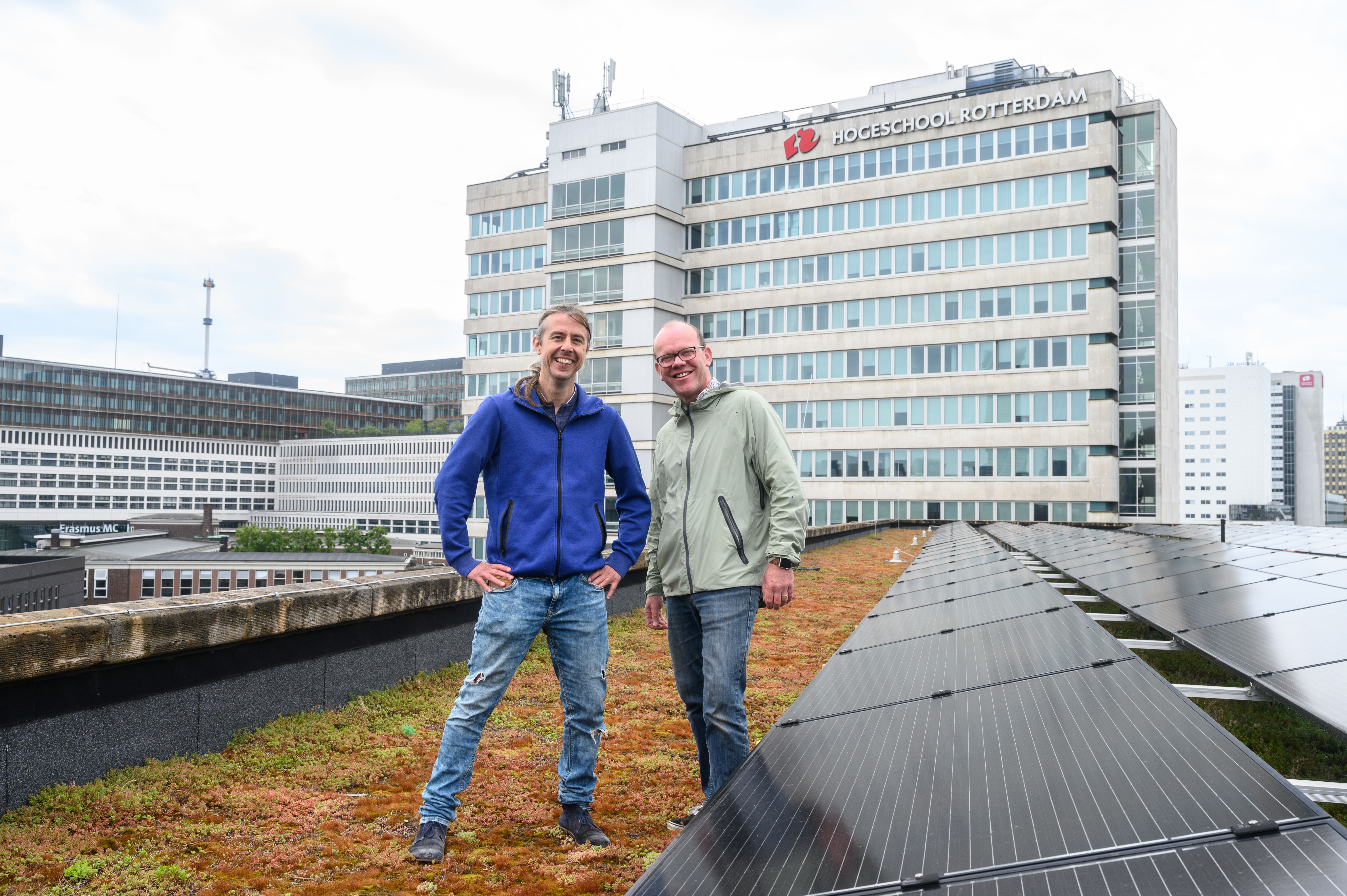 Op het dak van locatie Museumpark staan ook twee docenten: Thomas Linders van de opleiding Industrieel Product Ontwerpen en Kaj van de Sandt van de opleiding Watermanagement. Thomas vertelt hoe zij de duurzame projecten mogelijk hebben gemaakt: “Binnen ons onderwijs willen we onze studenten in aanraking brengen met de grote vraagstukken waar de samenleving mee worstelt. Ze zien vaak nog niet dat ze daadwerkelijk bij kunnen dragen aan oplossingen. Ze hebben kennis, creativiteit en kwaliteiten die ze kunnen inzetten om echte impact te behalen. Bijvoorbeeld om Rotterdam klimaatadaptiever te maken. Dit is nodig om de gevolgen van klimaatverandering het hoofd te kunnen bieden.”