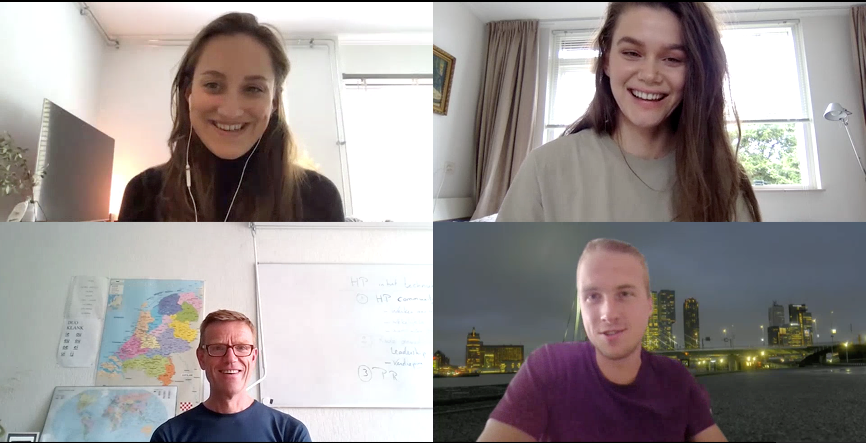 Teamsoverleg van (met de klok mee): Naomy Braamkolk (politie), Myrthle Ayal (student), Jeroen van Harmelen (student) en Peter Anker (docent)