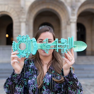 De jury was onder de indruk van de sleutel, waarbij verschillende elementen van de stad samenkomen. Stella: “Bovenaan zie je het wapen van Rotterdam. Het schild hebben we vervangen door de vorm van de Hofpleinfontein. Daaronder staan twee handen. Die staan voor de menselijke kant van Rotterdam. Onder de handen staat een havenkraan met rechts de ss Rotterdam. En links de floating farm. Dit is de eerste drijvende boerderij ter wereld. We vonden dit zo’n mooi en innovatief initiatief dat we die op de sleutel hebben gezet. Daaronder is een schep te zien waarop staat: ‘When you come to Rotterdam, you come to see the world’. Dit is een quote van burgemeester Aboutaleb. Het geeft aan dat Rotterdam een multiculturele stad is.”