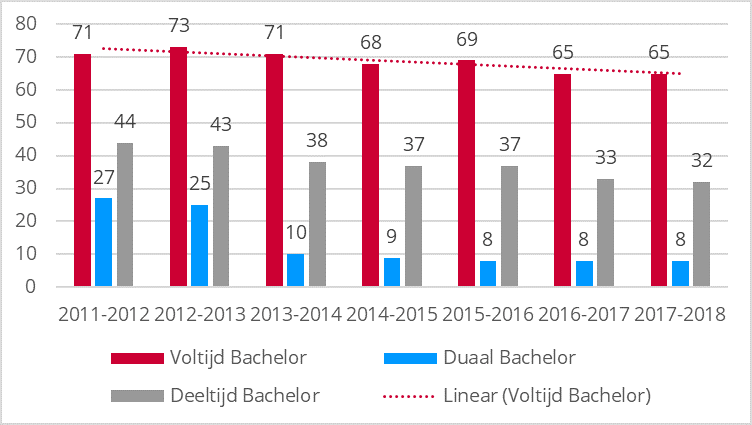 Het aantal voltijdse en duale bacheloropleidingen is in 2017 stabiel gebleven ten opzichte van 2016. In 2018 zal wél een grote verschuiving in het aanbod plaatsvinden in verband met een landelijke conversie van opleidingen binnen het economisch domein. Hierbij worden niet alleen opleidingen samengevoegd, maar verandert een groot aantal opleidingen ook van naam. Het belangrijkste doel hiervan is om het landelijke aanbod van economische bacheloropleidingen overzichtelijker en transparanter te maken voor studiekiezers en het werkveld.