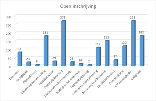 In het studiejaar 2016-2017 namen 1515 deelnemers deel aan activiteiten met open inschrijving. Van dit aantal medewerkers was 52% docent. Het no show-percentage was 5%. Daarnaast ondersteunde de HR Academie 77 incompany activiteiten: 68 binnen de instituten en 9 binnen de diensten. Onderstaand diagram schetst de verdeling open inschrijving en incompany over de verschillende thema’s binnen de HR Academie.
