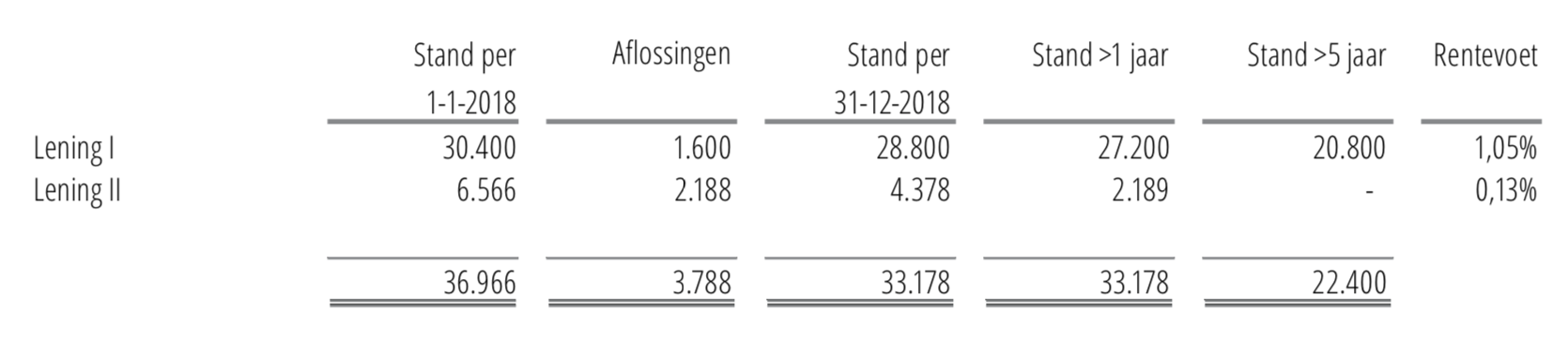 Lening I heeft een looptijd van twintig jaar en wordt in gelijke jaarlijkse delen van 1,6 miljoen euro afgelost. Lening II is aangegaan voor vier jaar en wordt gedurende deze looptijd in gelijke jaarlijkse delen van circa 2,2 miljoen euro afgelost.
