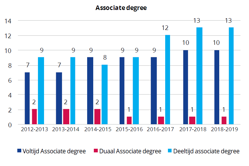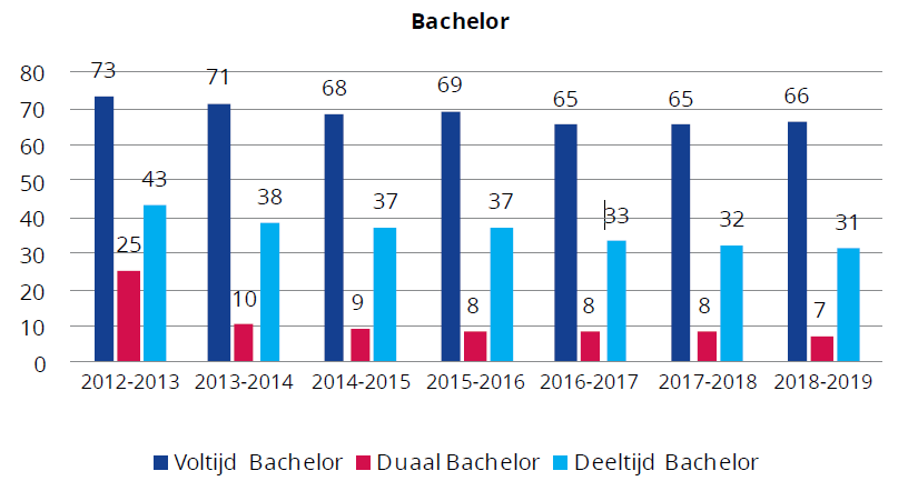 Het aantal voltijd-bacheloropleidingen is in 2018 met één gestegen door de start van de differentiatie International Business & Supply Chain Management binnen de opleiding International Business (zie bovenstaande tabel). Het aantal duale opleidingen is gedaald door het stopzetten van de duale route van Ondernemerschap & Retail Management. Ook het aantal deeltijd-bacheloropleidingen is met één gedaald naar 31. De instroom van nieuwe studenten bij de deeltijdvariant van de bachelor Management in de Zorg is stopgezet. Studenten kunnen nog wel starten met de Associate degree Management in de Zorg.