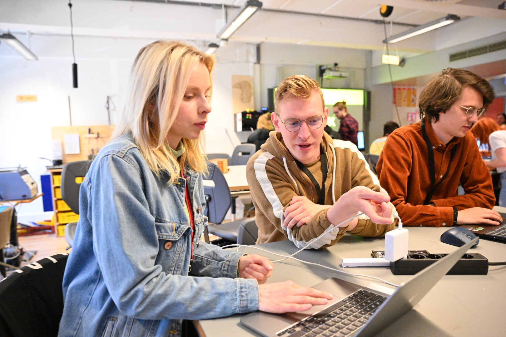 3D printers en lasersnijders worden steeds ‘gewoner.’ Hoe blijft het Stadslab innovatief? ‘’We richten ons nu op immersive tech’’, zegt docent Elise van Beurden. ‘’Daarmee bedoel ik artificial intelligence en virtual reality. Eigenlijk is dat vreemd want we besteedden heel veel tijd aan digitaal naar fysiek. Nu gaan we de andere kant op. Je moet VR echt ervaren om je in te leven. Daarom brengen we het naar de studenten via workshops en andere manieren. Het instituut van Gezondheidszorg heeft bijvoorbeeld een immersive room waar ze interactieve video’s projecteren op de muren. Met een windturbine, geurmachine en geluid creëren ze realistische omgeving voor de studenten om te trainen. Die ervaring leert ze impulsief en correct te handelen.’’