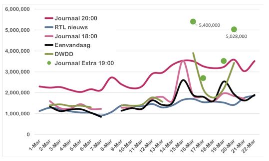 Zie in deze tabel hoe populair het NOS journaal was tijdens de coronapiek: Er keken steeds meer dan 2 miljoen mensen.