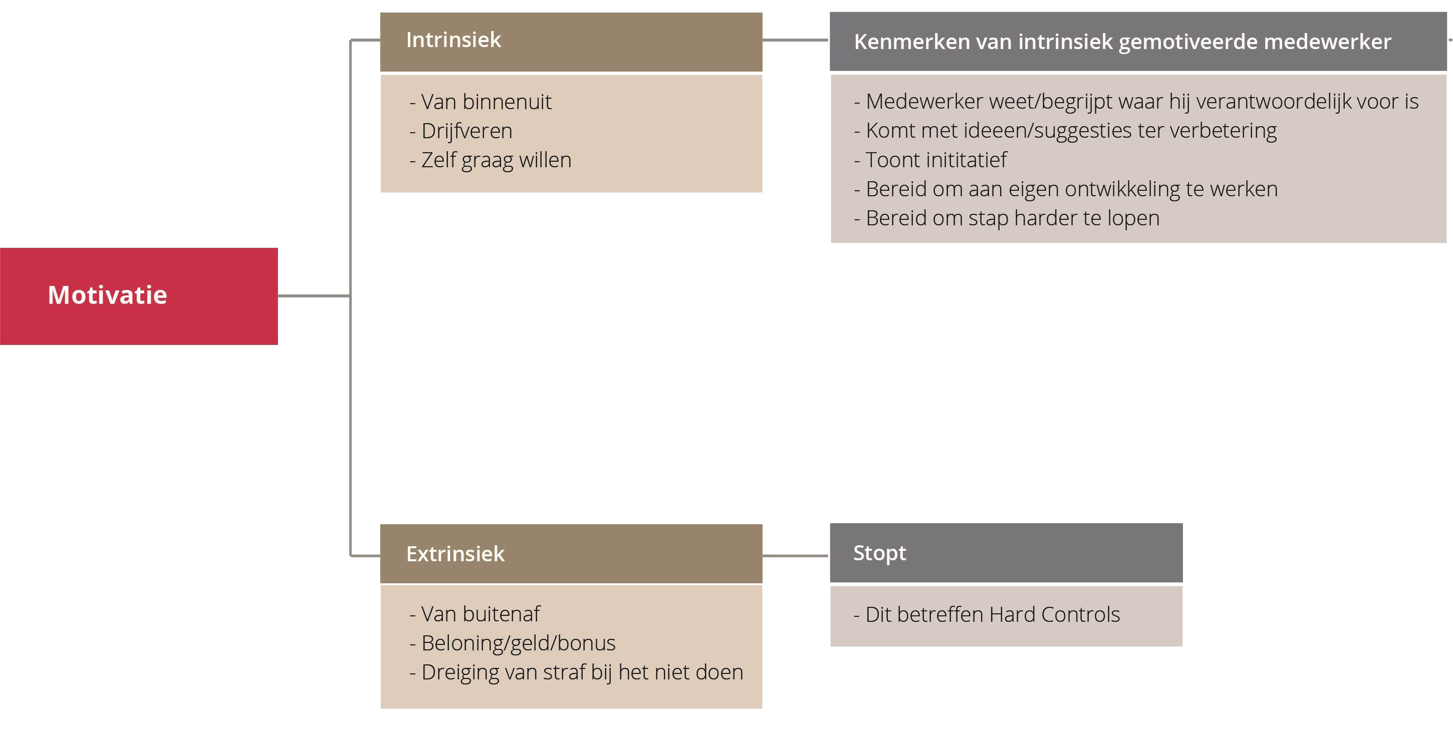Intrinsieke motivatie is de motivatie die vanuit de medewerker zelf komt. Bij intrinsieke motivatie gaat het om het bereiken van werkdoelen door aandacht voor menselijke behoeften zoals verbondenheid, autonomie en competentie. - Extrinsieke motivatie
