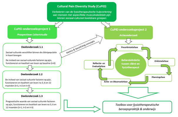 De CuPiD-studie heeft als doel om de fysiotherapeutische zorg voor patiënten met aspecifieke musculoskeletale pijnklachten te verbeteren. Enerzijds wordt dat gedaan door te kijken naar verschillen in de ervaring van pijn, beperkingen en kwaliteit van leven tussen groepen patiënten met verschillende sociaal-culturele achtergronden. Zo wordt er gekeken naar de rol van woonsituatie, opleidingsniveau, afkomst en taal. Anderzijds wordt in het onderzoek gekeken of sociaal-culturele factoren mogelijk voorspellers zijn voor het hebben van klachten op langere termijn.