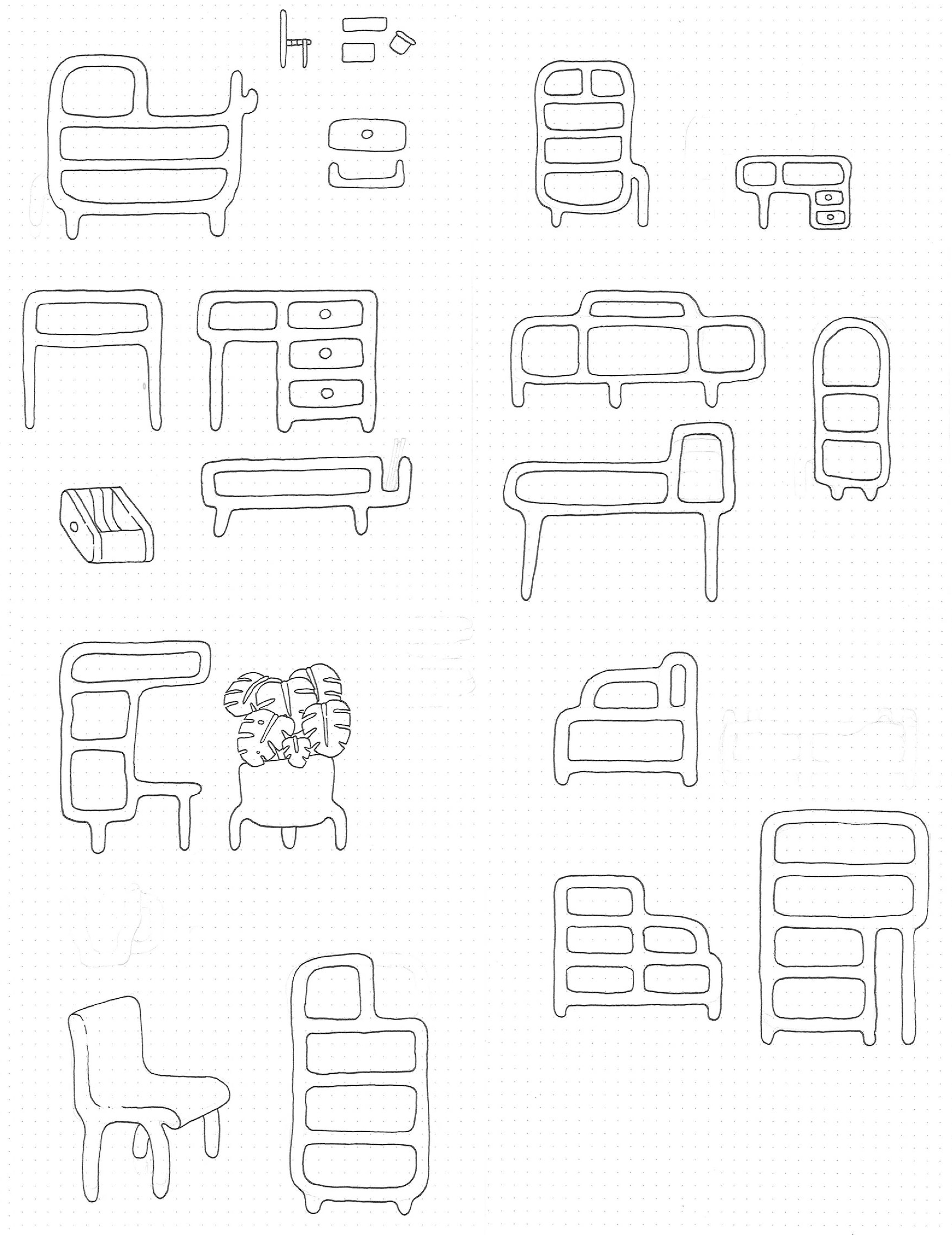 Een serie meubels die is ontstaan uit het vertalen van mijn tekenstijl naar tastbare vormen. Ik begon dit project met het genereren van vormstudies om zo de rode draad in mijn werk te kunnen vinden. Het enige wat consistent was tijdens het uitvoeren van deze vormstudies waren mijn schetsen. Deze stijl van tekenen is iets dat niet terug is te vinden in mijn werk, er mist dus iets in de vertaling van schets naar product. In deze serie zoek ik naar de perfecte balans tussen mijn schetsen en producten.