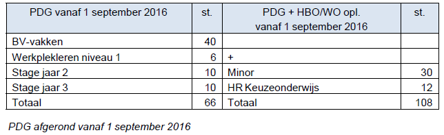 Een student met een afgerond PDG vanaf 1 september 2016 en volgend, die zich aanmeldt voor de tweedegraads lerarenopleiding, krijgt vrijstelling voor: het hele BV-programma (40 sp.), Werkplekleren niveau 1 (6 sp.), stage jaar 2 (10 sp.), stage jaar 3 (10 sp.), totaal 66 studiepunten.